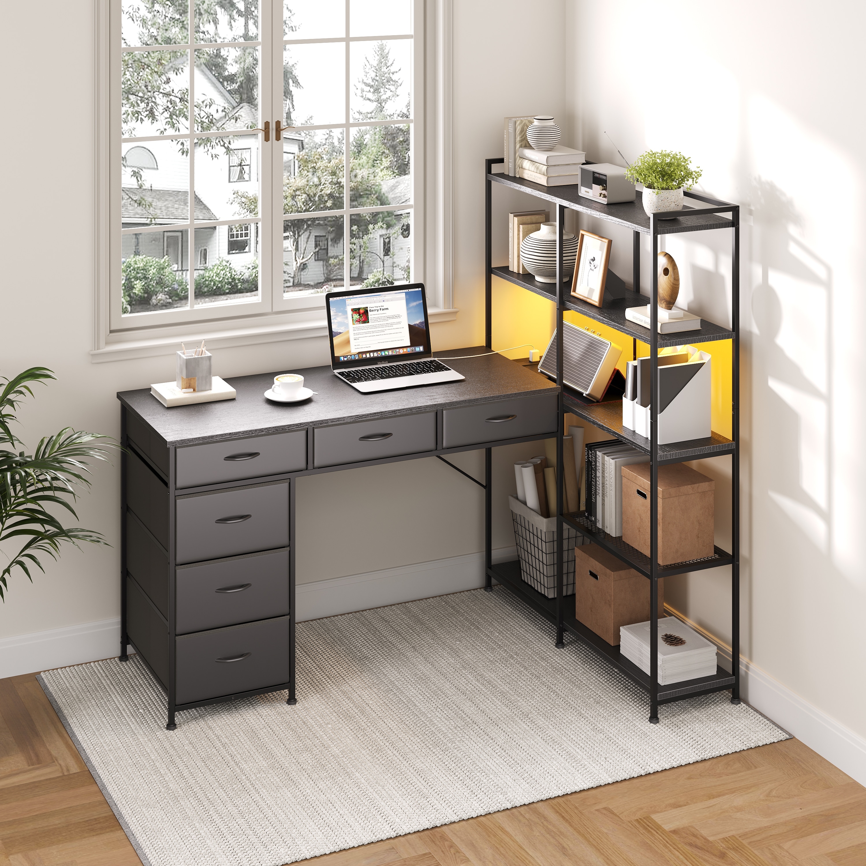 L-Shaped Corner Desk with 6 Drawers, 5-Tier Shelves, LED & Power Outlets, 47.2 Inch Workstation for Office & Gaming