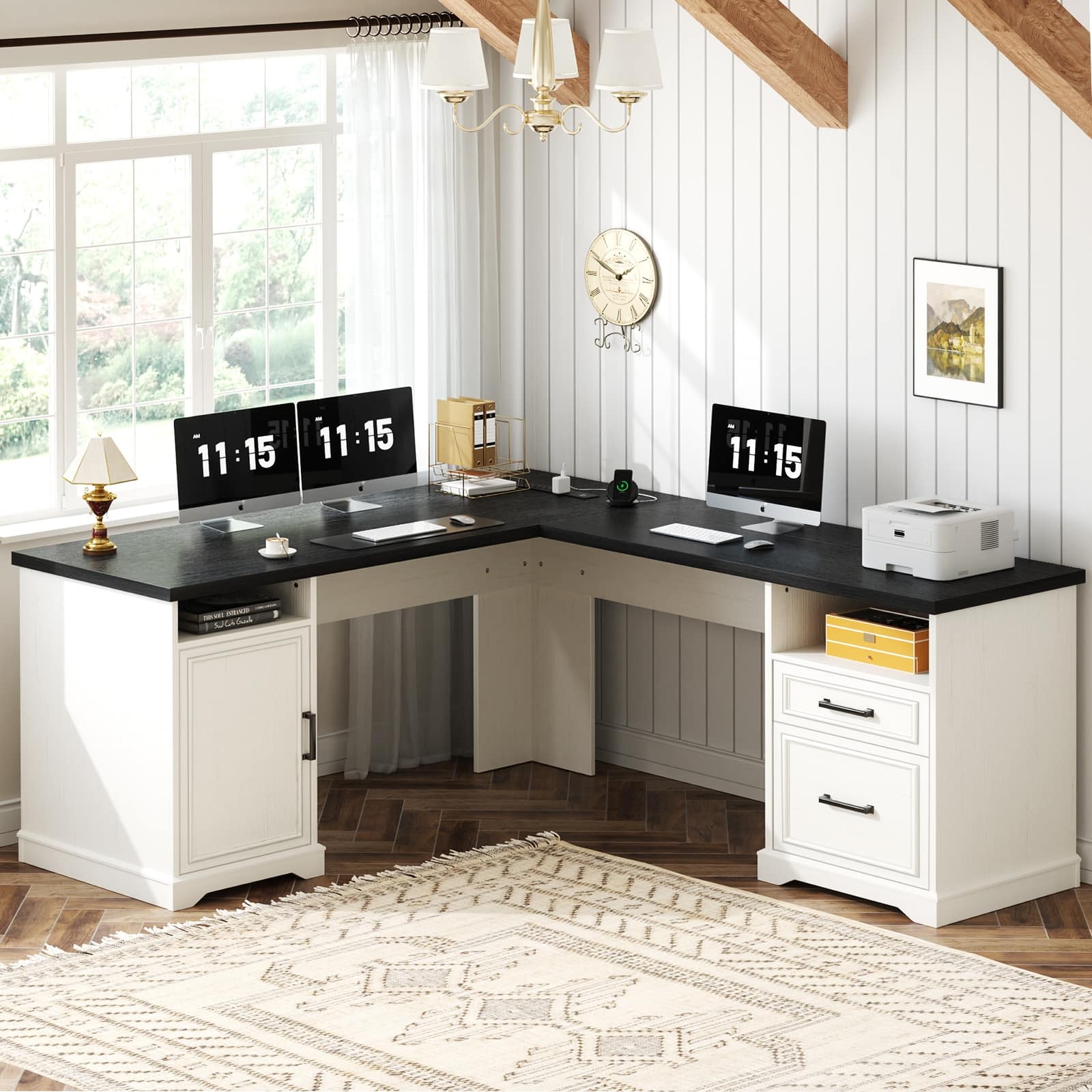 French Country L Shaped Desk with Charging Station, Office Computer Table with File Cabinet