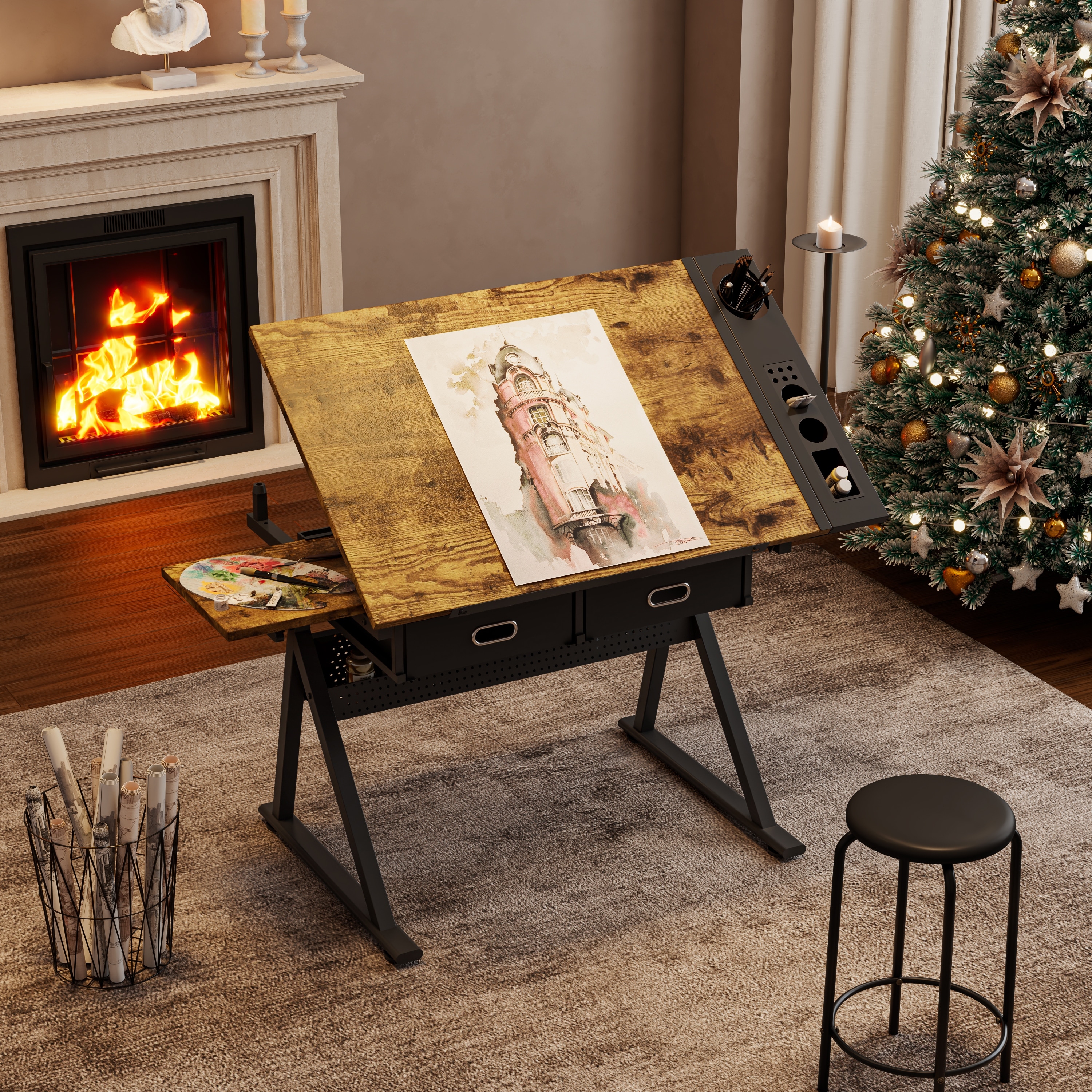 adjustable drawing drafting table desk with 2 drawers for home office and school with stool