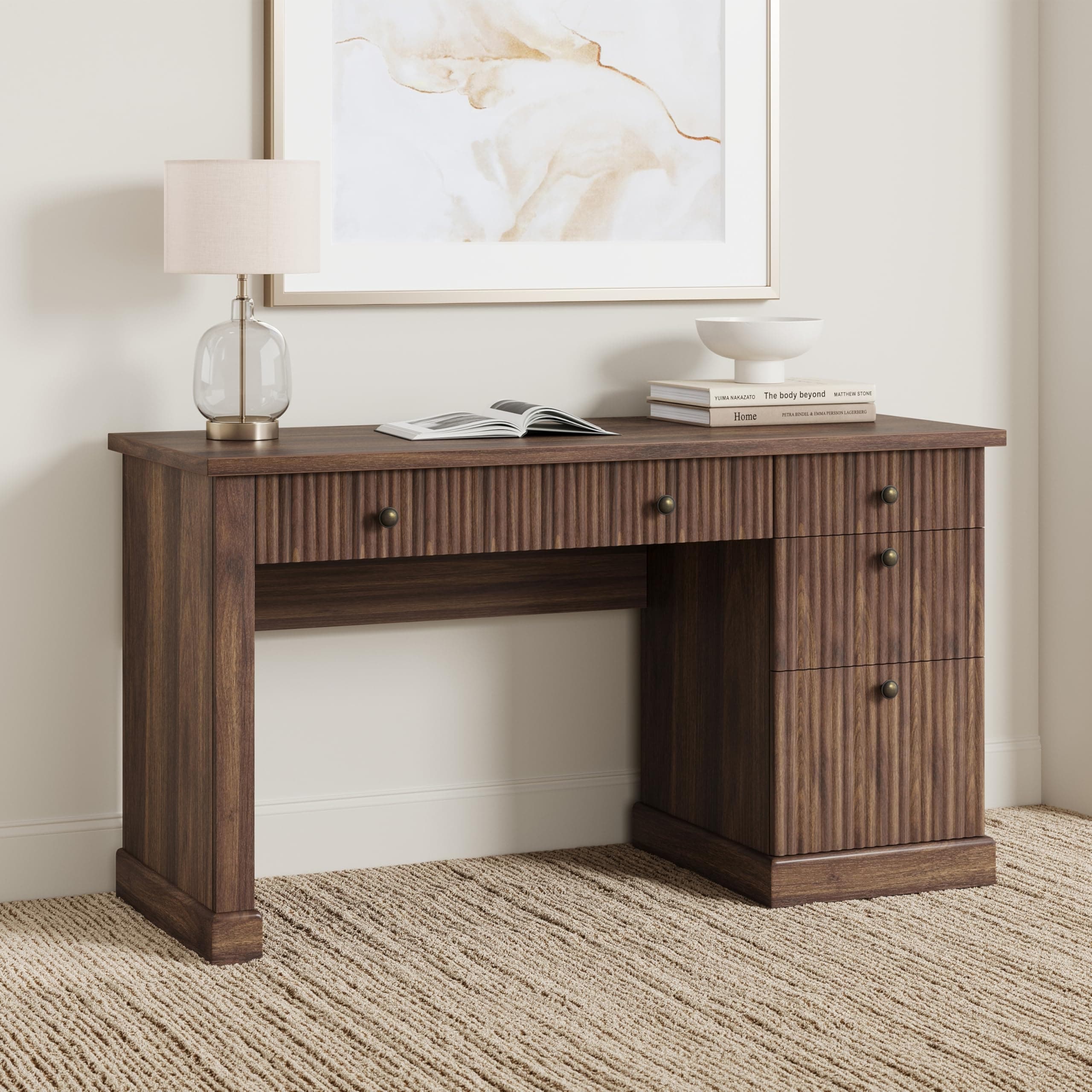 Fluted Writing Desk with Storage, Office Desk with Charging Station, Wooden Computer Desk with Drawers for Storage File