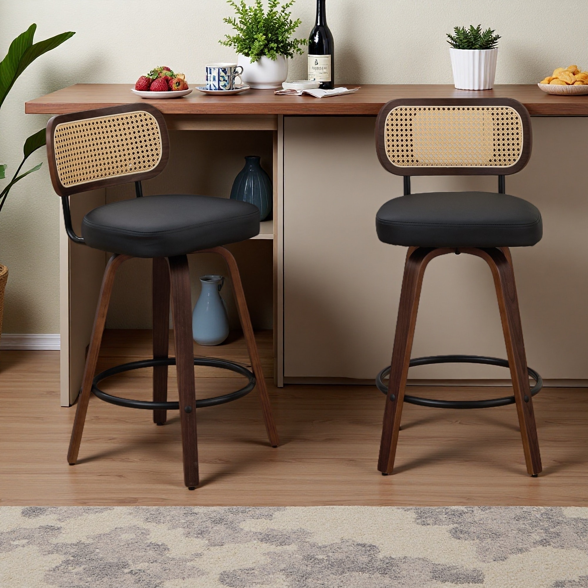 35.43"H Set of 2 Swivel Counter Height Bar Stools with Cane Rattan Back & Walnut Wood Legs-360° Rotation for Kitchen & Bar