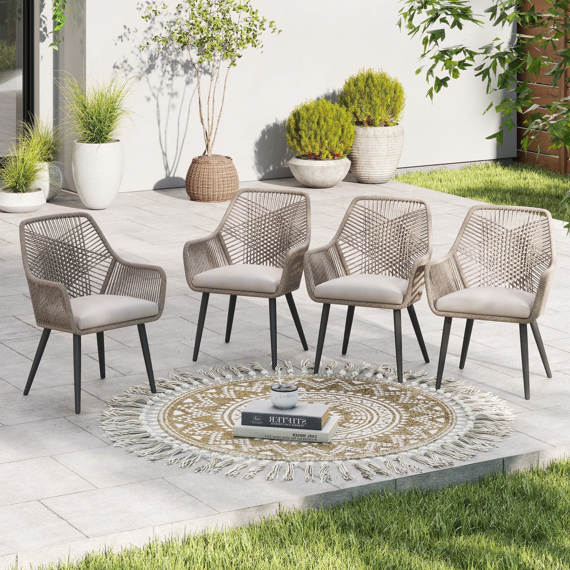 Outdoor Patio Woven Rope Dining Chairs With Armrest and Seat Cushions