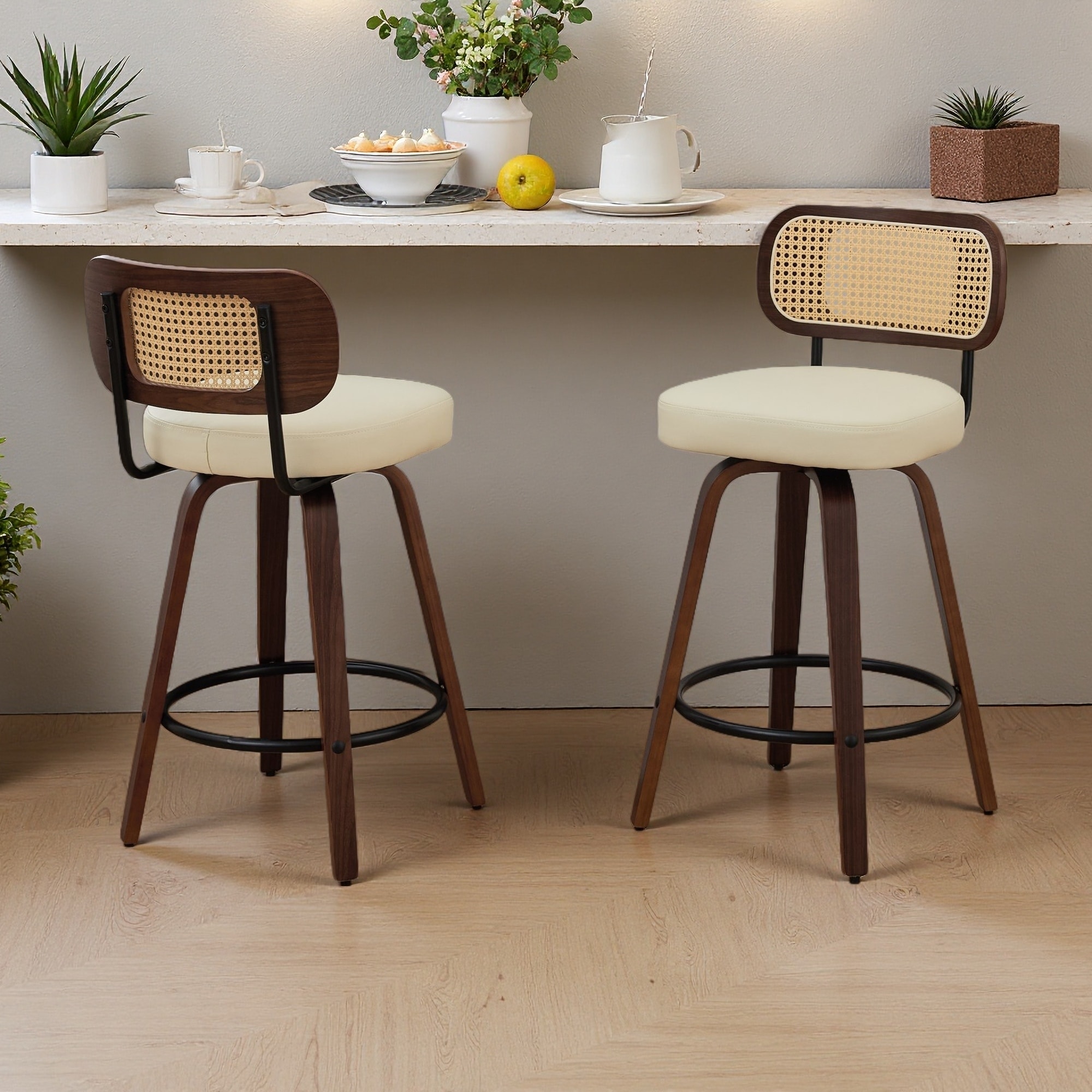 35.43"H Set of 2 Swivel Counter Height Bar Stools with Cane Rattan Back & Walnut Wood Legs-360° Rotation for Kitchen & Bar