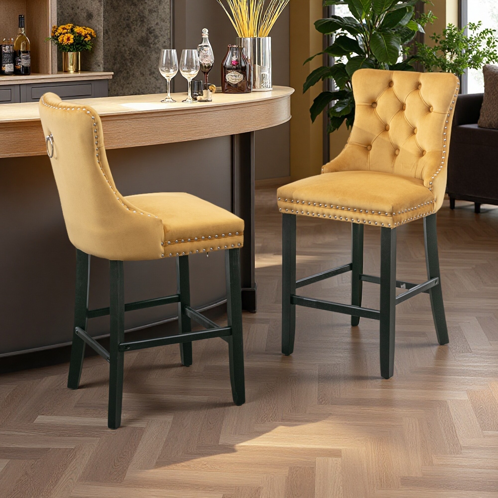 40.7"H Set of 2 Contemporary Velvet Upholstered Barstools with Button Tufted Backrest, Chrome Nailhead Trim, Solid Wood Legs