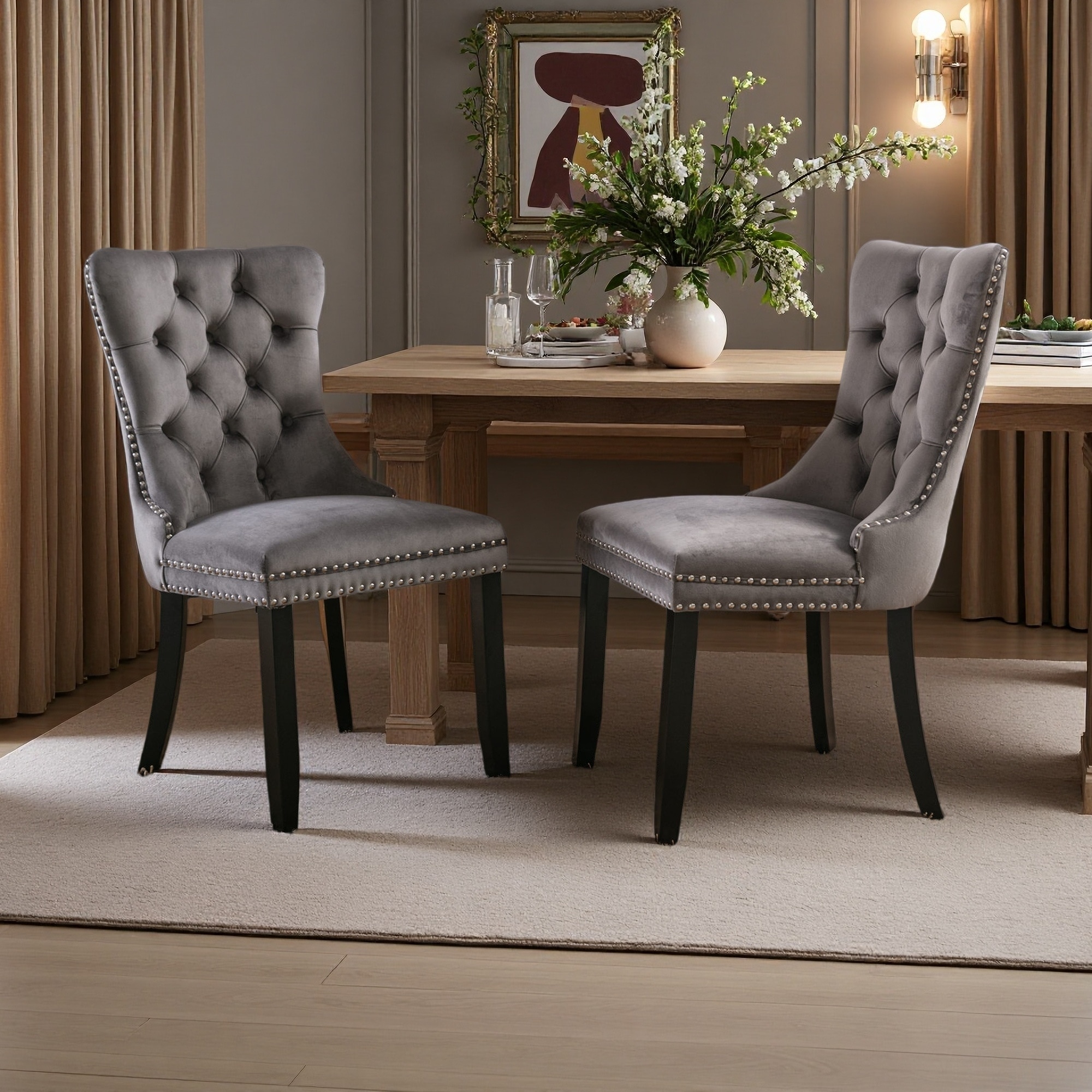 Velvet Dining Chairs Set of 2, Tufted Upholstered Dining Room Chairs, Kitchen Chair with Back Ring Pull & Nailhead Trim