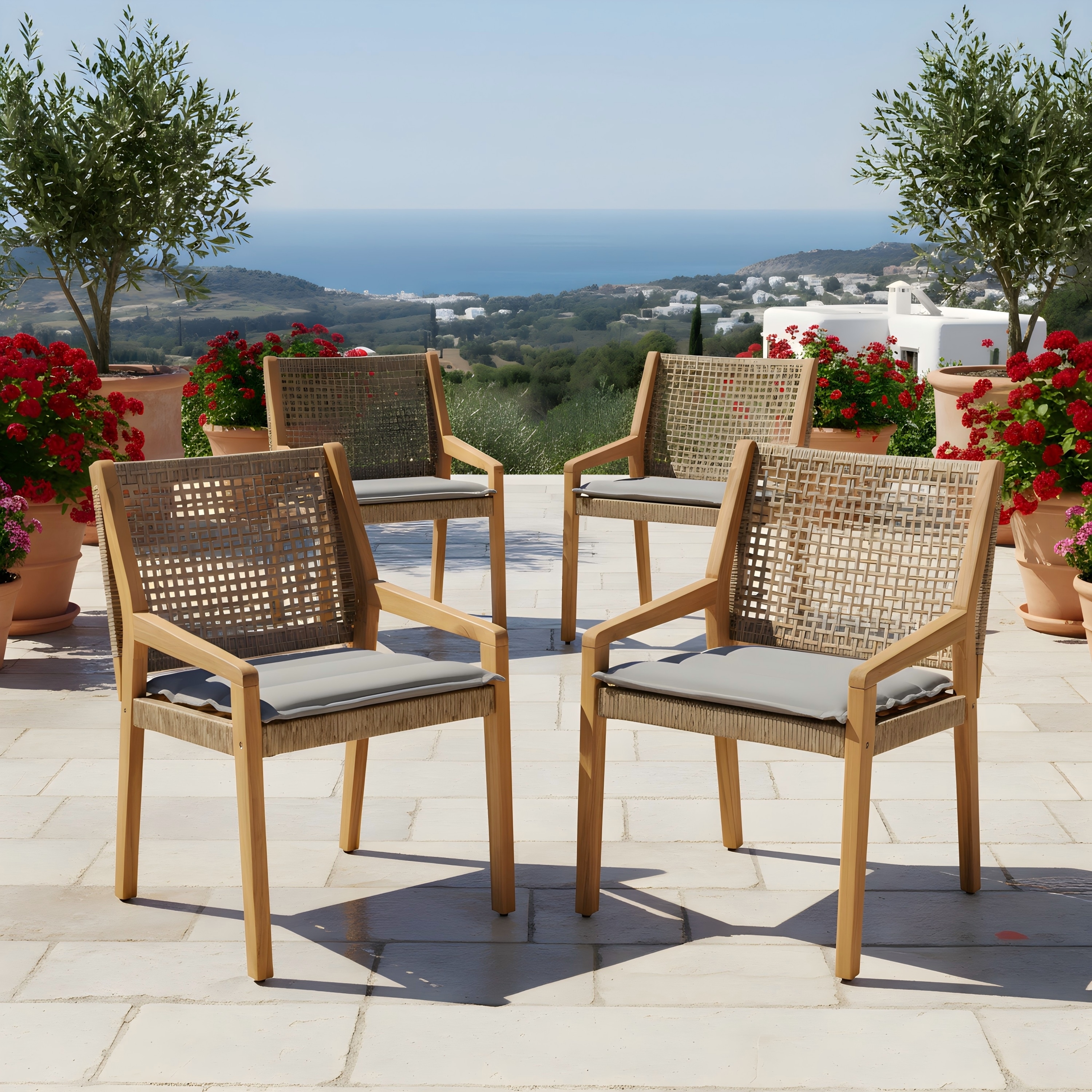 Roomfitters 4-Piece Outdoor Braided Acacia Wood Chairs Teak Look and Rope Weave Armchairs for Garden Backyard Poolside