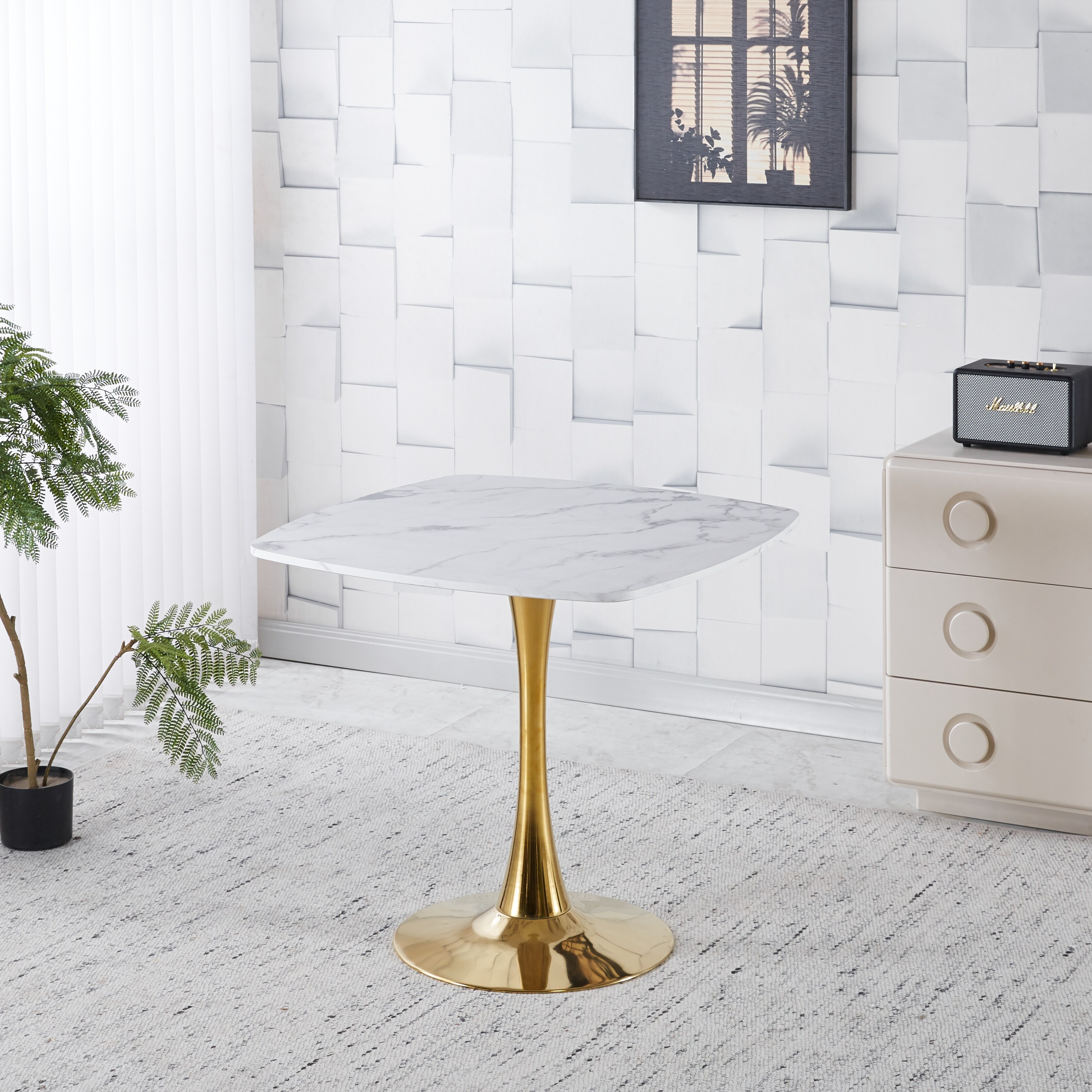 Square Tulip Dining Table With Golden Metal Pedestal Base