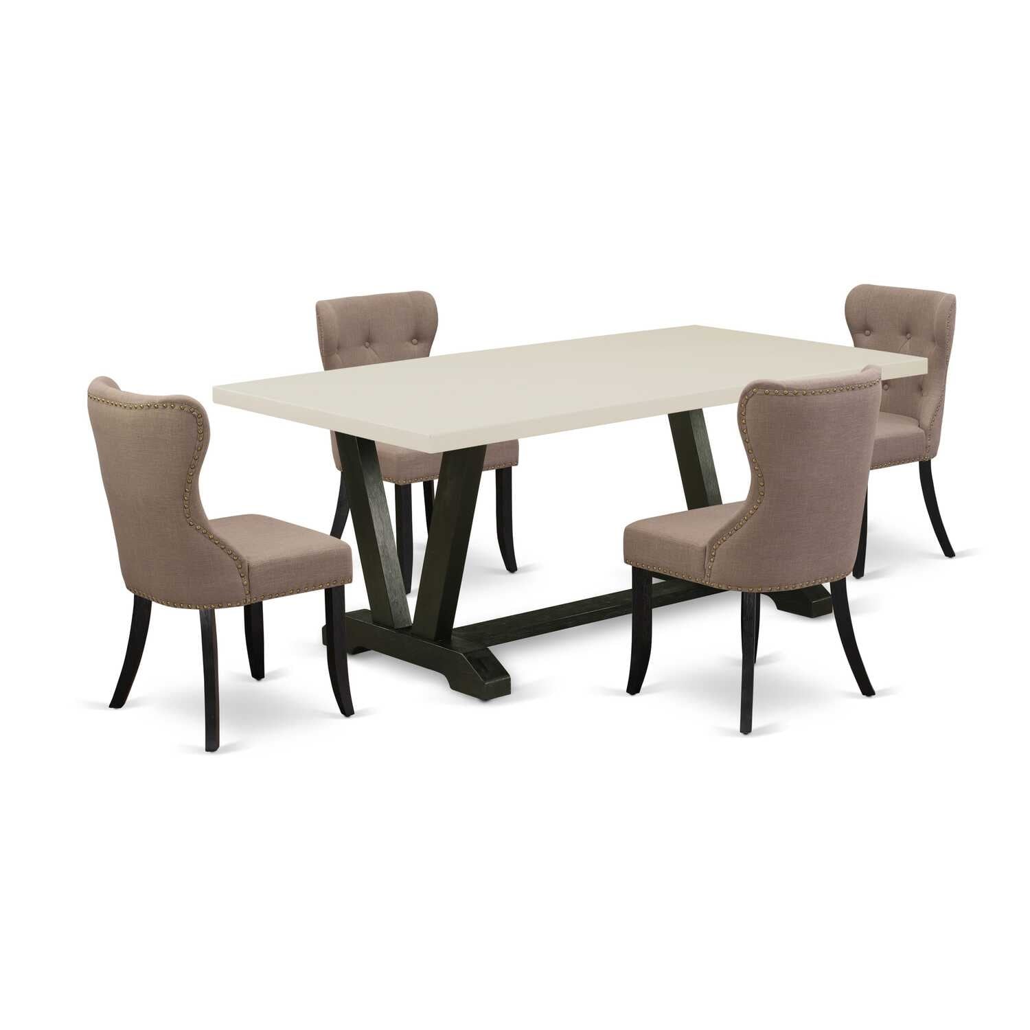 Art Nouveau Dining Set - 5 Piece Table & Chair Set - Linen Fabric Upholstered Chairs - Rectangular Table - Living Room Furniture
