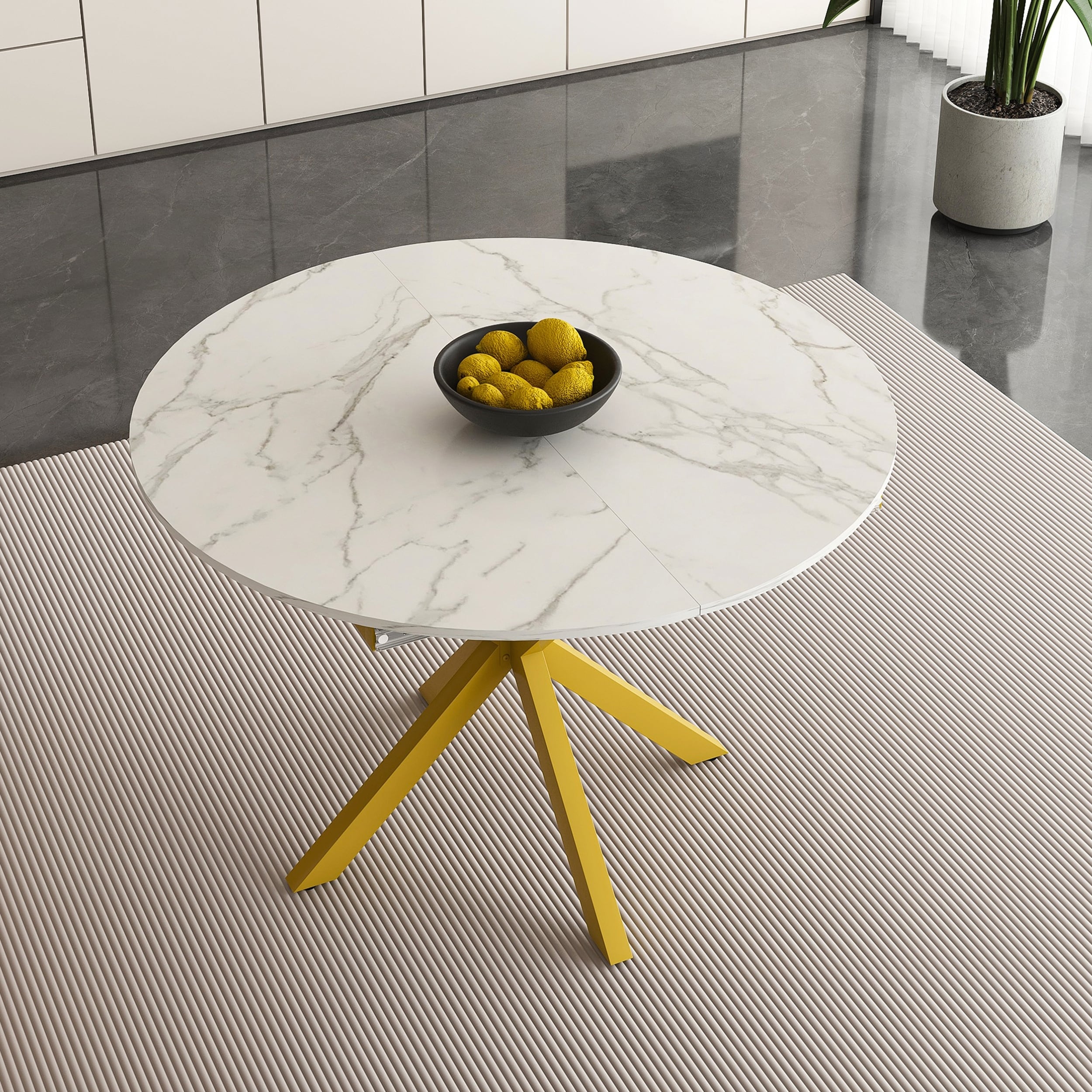 Modern Round Dining Table with Extendable Blades, Carbon Steel X-Base, Sturdy and Durable for Small Apartments and Kitchens