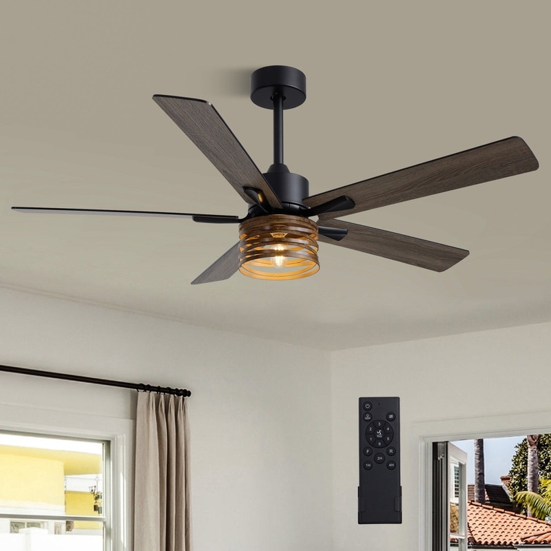 Modern 52" Ceiling Fan Matte Black, Light, Remote, Wood Blades, Quiet Motor