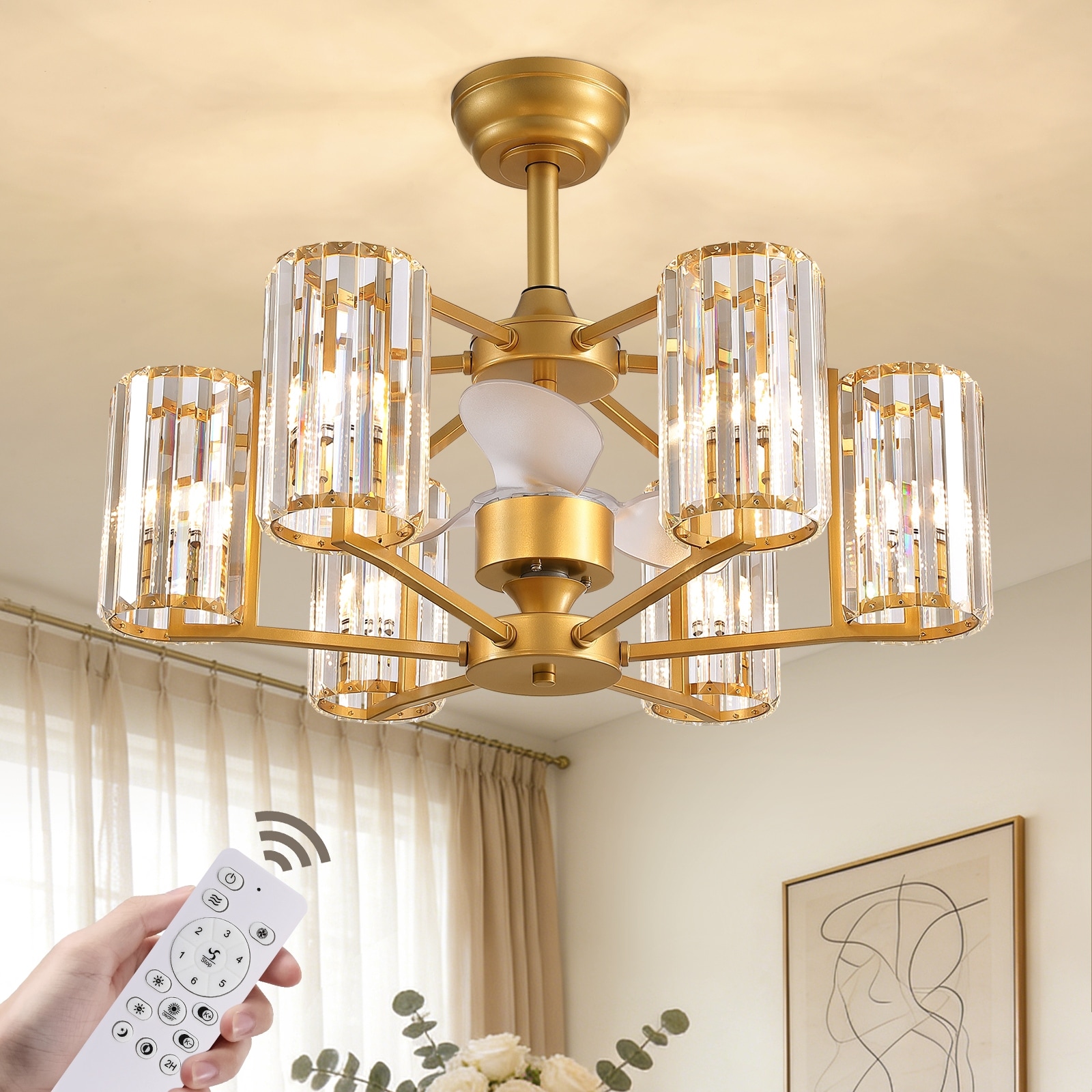 27" 6-Light Vintage Crystal Column Gold Cage Dimmable Ceiling Fan - 27''-6 Lights