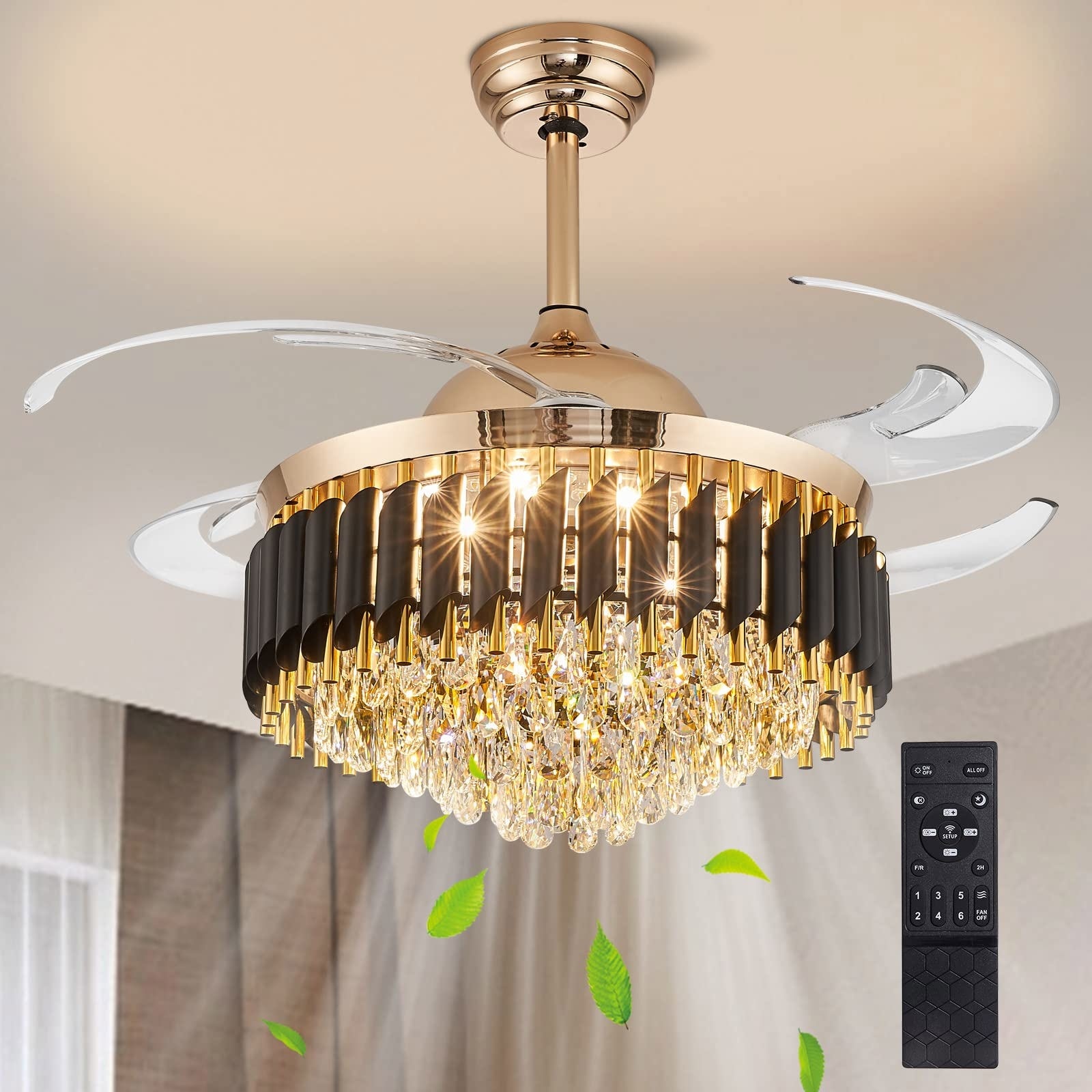 52" Modern Gold Black Retractable Crystal Chandelier Ceiling Fans Dimmable Light - 52''