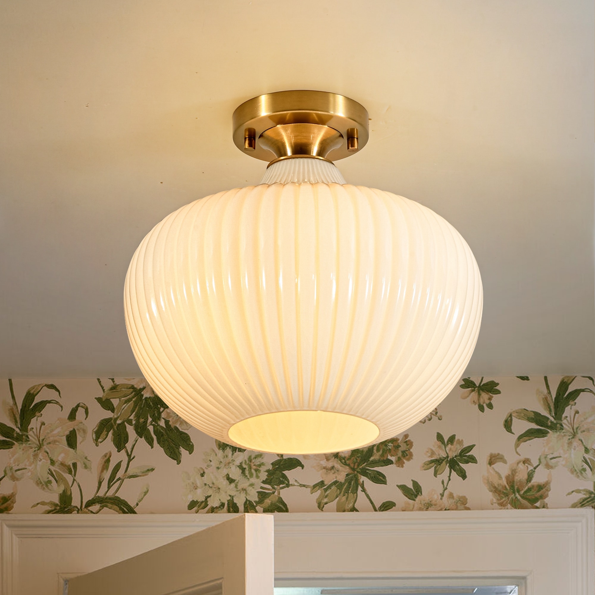 1-Light Modern Elegant Ribbed Glass Flush Mount with Brushed Brass/Matte Black Finish for Bedroom & Foyer