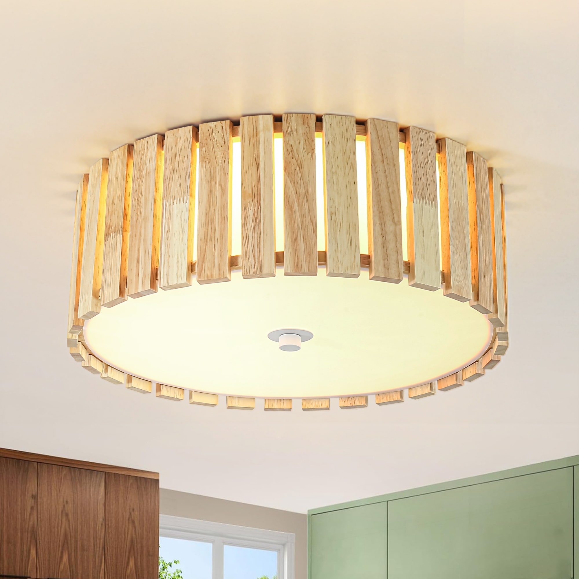 14.2" Rustic Boho Wooden Strips Cylindrical Drum Shade LED Flush Mount Ceiling Light for Living Room
