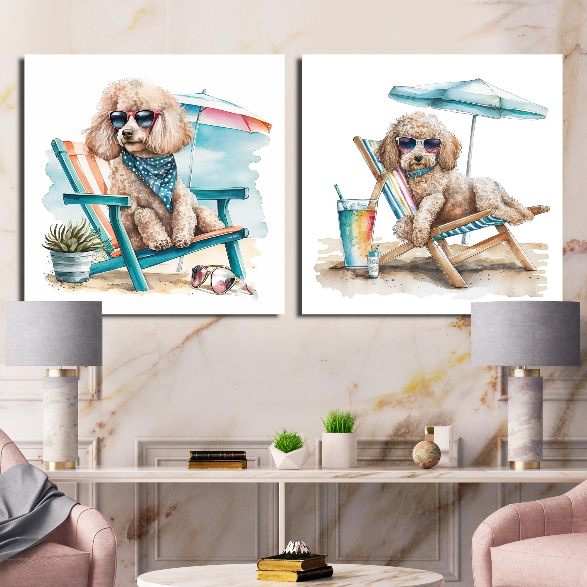 Designart "Dog On Chair At The Beach" Animals Canvas Set Of 2 - Traditional Wall Art Set Beige Wall Art 2 Pieces
