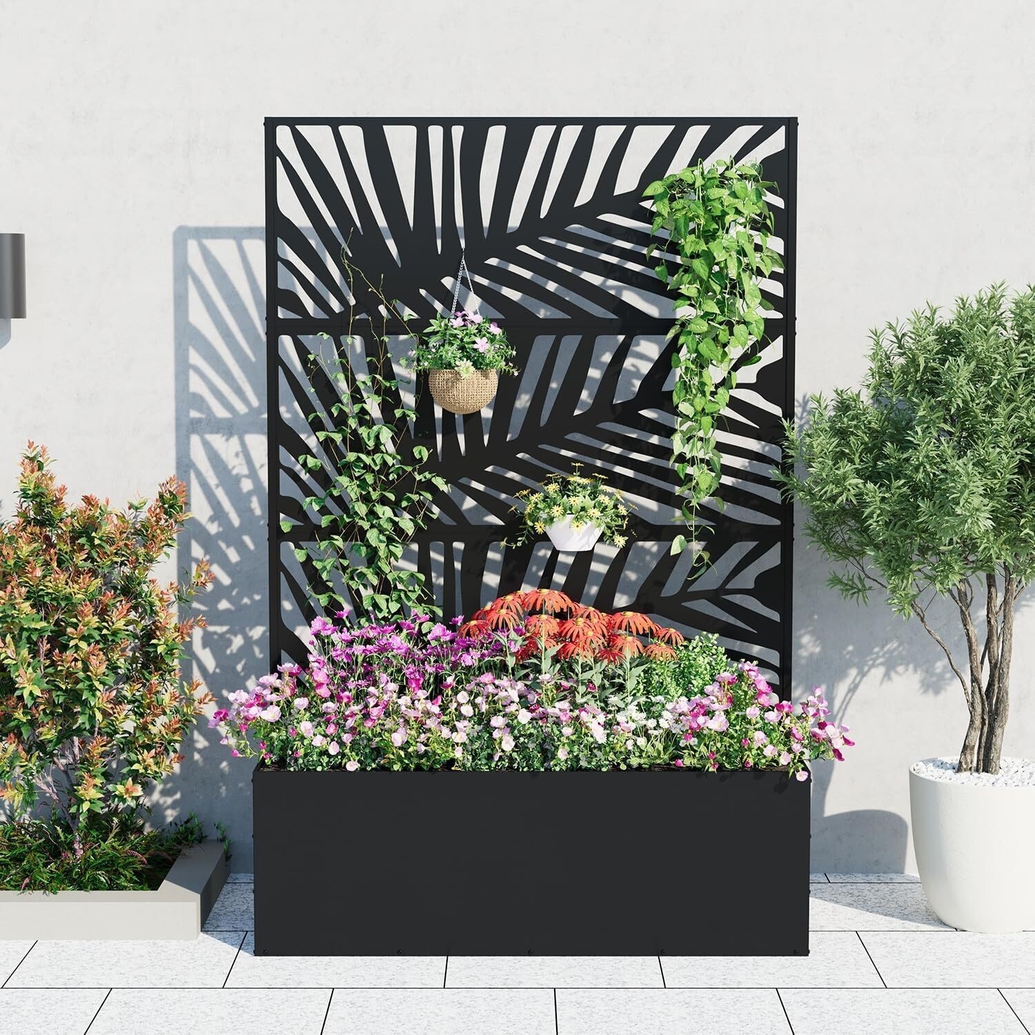 Metal Privacy Screen Planter Box, Raised Garden Bed for Climbing Plants, Veggies, Palm Leaf Style