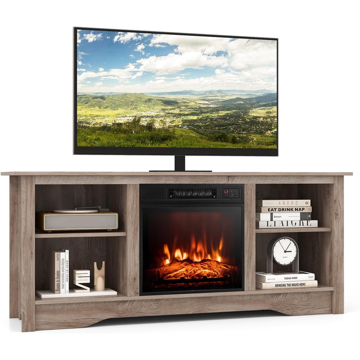 TV stand with 18-inch electric fireplace, remote control, adjustable shelves in grey