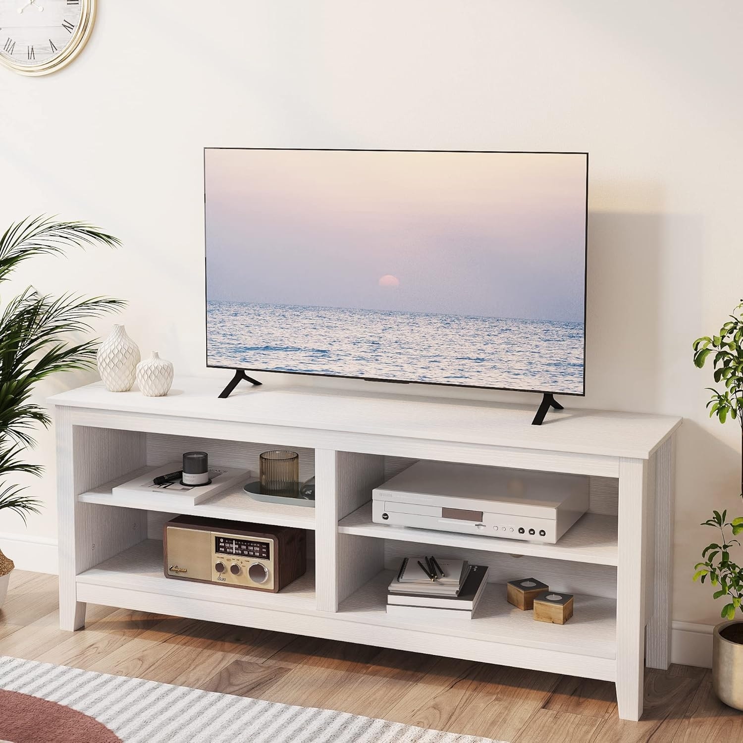 TV Stand for 65 Inch, White Wood Cabinet with 4 Shelves, Fits 50-65 Inch TVs, 55" W x 15" D x 22.8" H