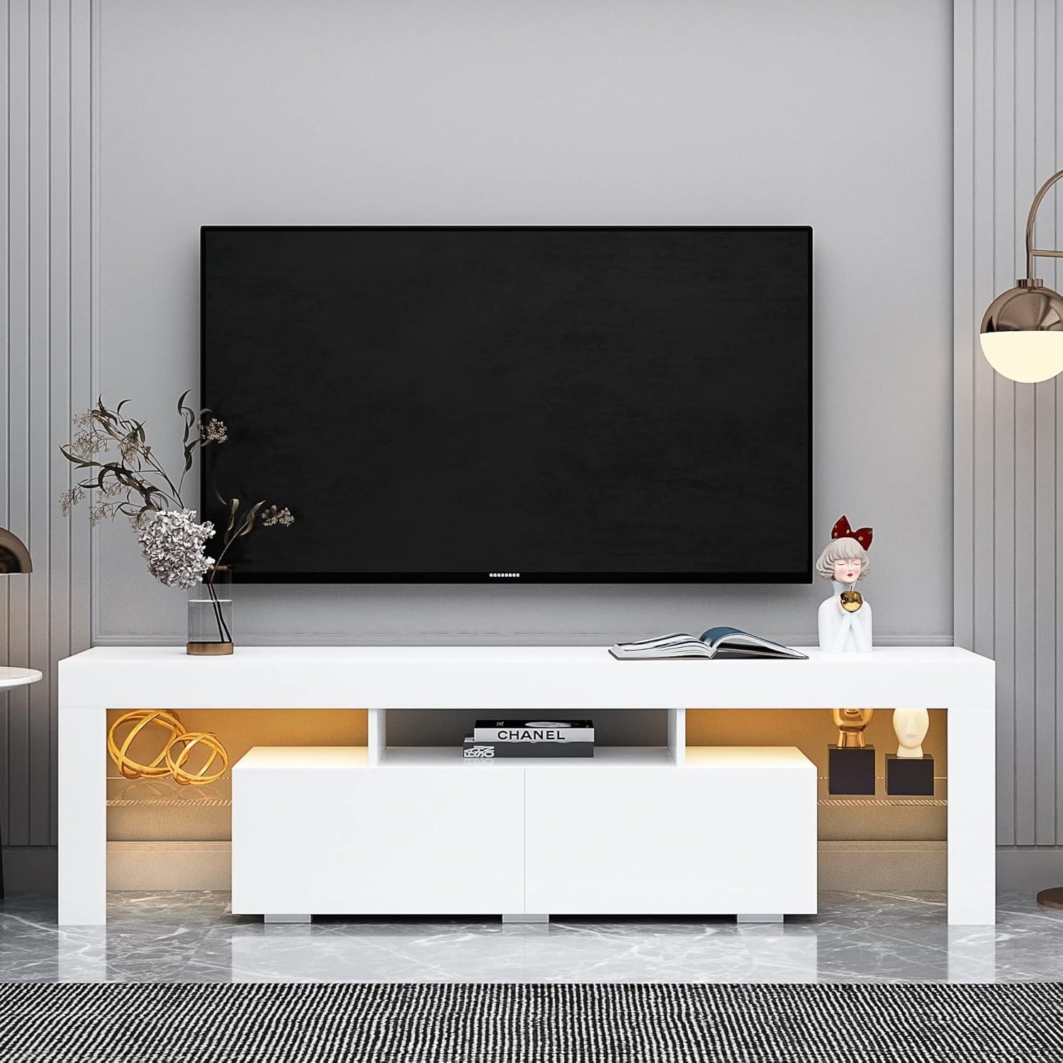 Modern High-Gloss LED TV Console for Up to 70 inch TVs with 20 Color Lights, Storage Drawers & Shelves