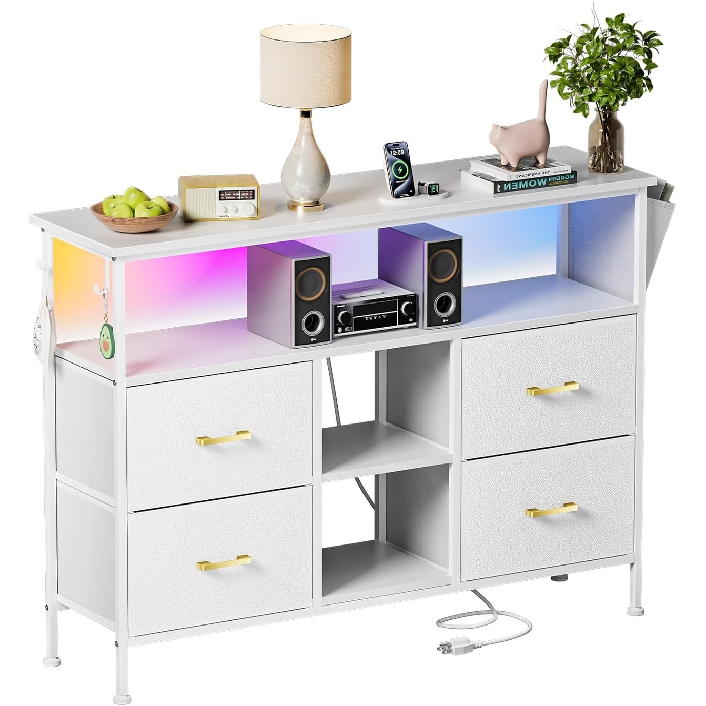 Modern TV Stand with Power Outlet, 4 Fabric Drawers & Shelves for Living Room or Bedroom, Fits Up to 50" TVs, White