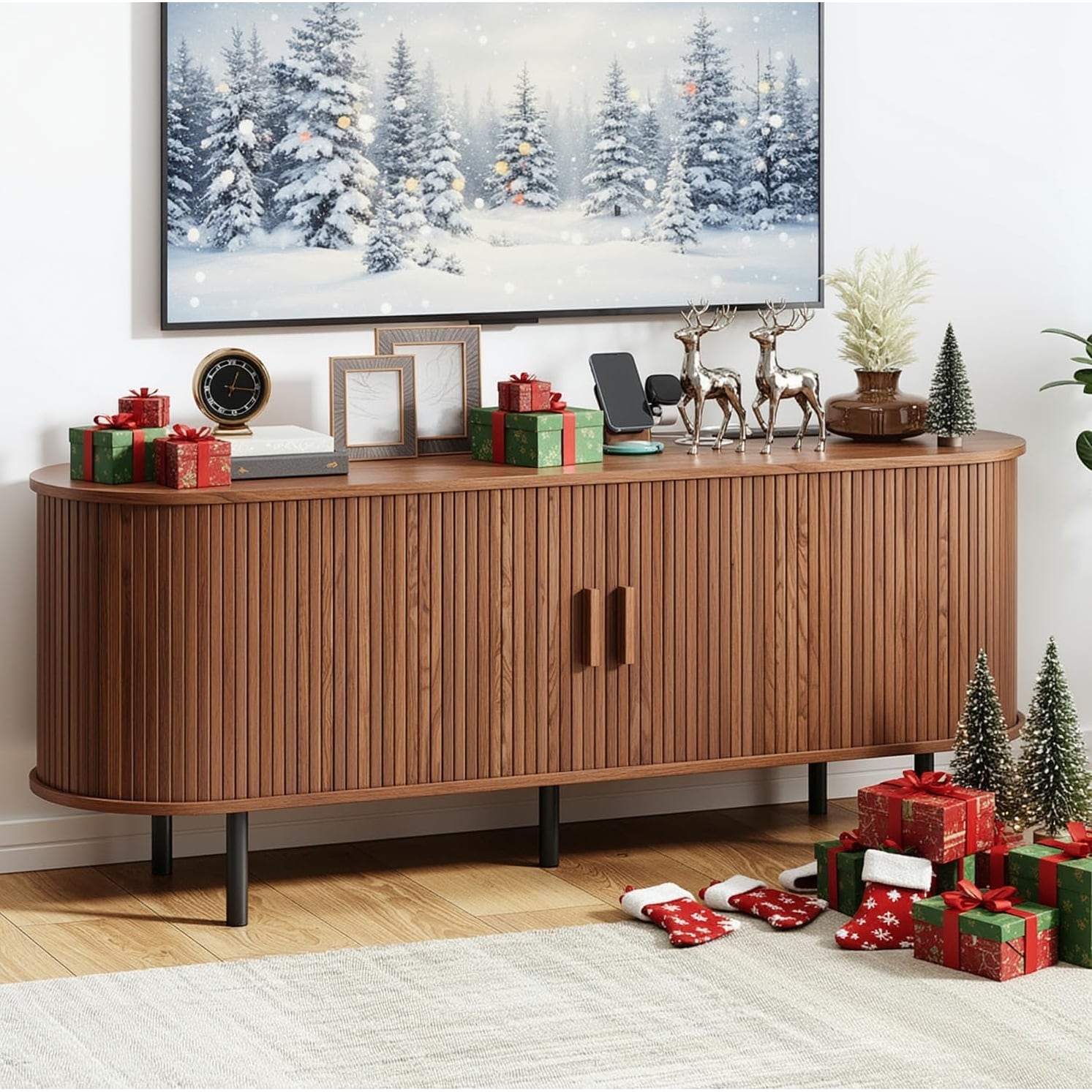 55" TV Stand with Power Outlet, Mid-Century Modern Fluted Media Console with Sliding Doors, Adjustable Shelves, Walnut