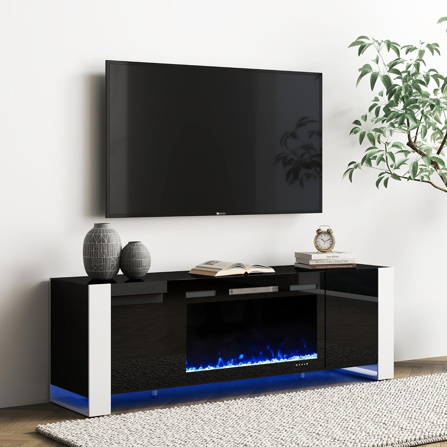 U-Shaped Leg TV Stand with 36" Electric Fireplace, High Gloss Finish for TVs Up to 80", Living Room Console Cabinet