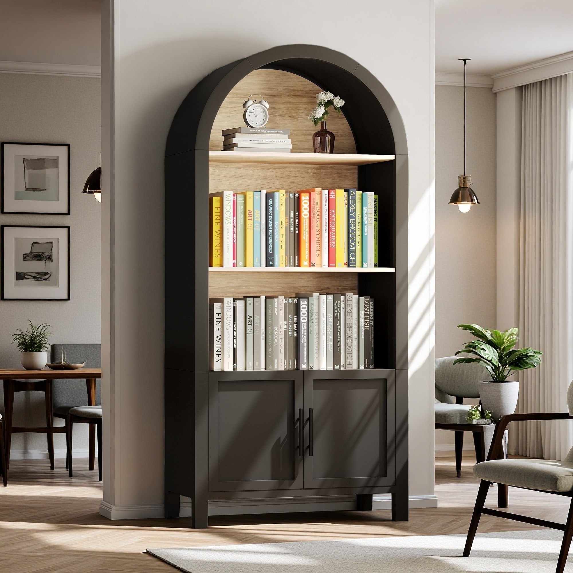 66.7"H Arched Bookcase with Natural Wood Shelves, 3-Tier Cabinet with Door and Open Display Shelf for Living Room, Dining Room