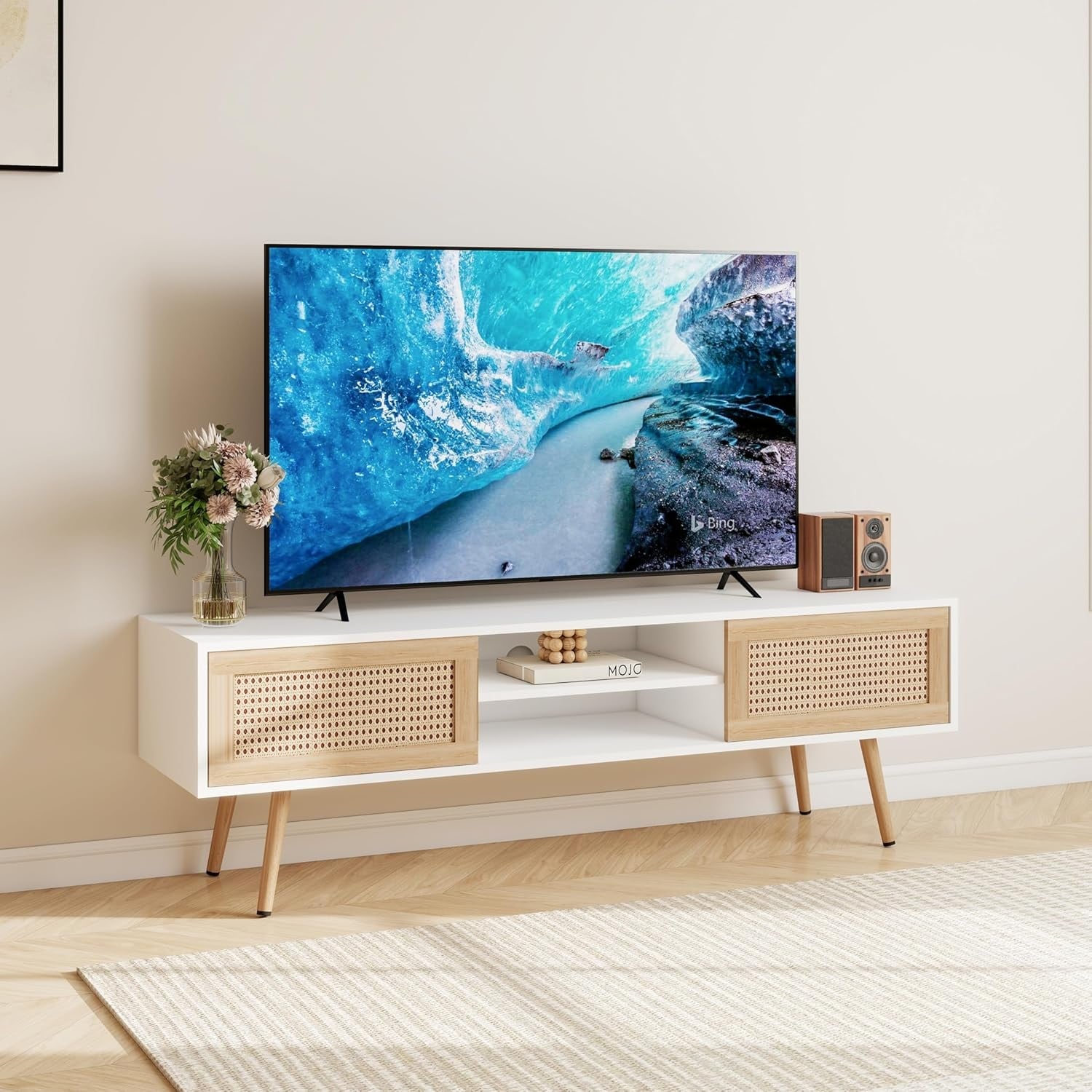 TV Stand for 65 Inch, Boho Design with Rattan Doors & Adjustable Shelf, Wood Media Console for Living Room, White