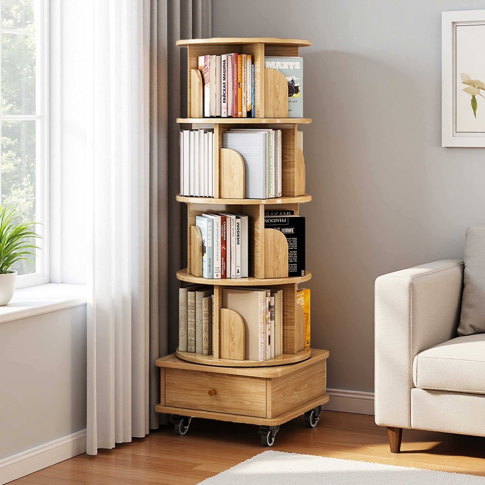 55.9"H 5-Tier Rotating Bookshelf, 360° Round, Wheels, Space-Saving Storage Tower