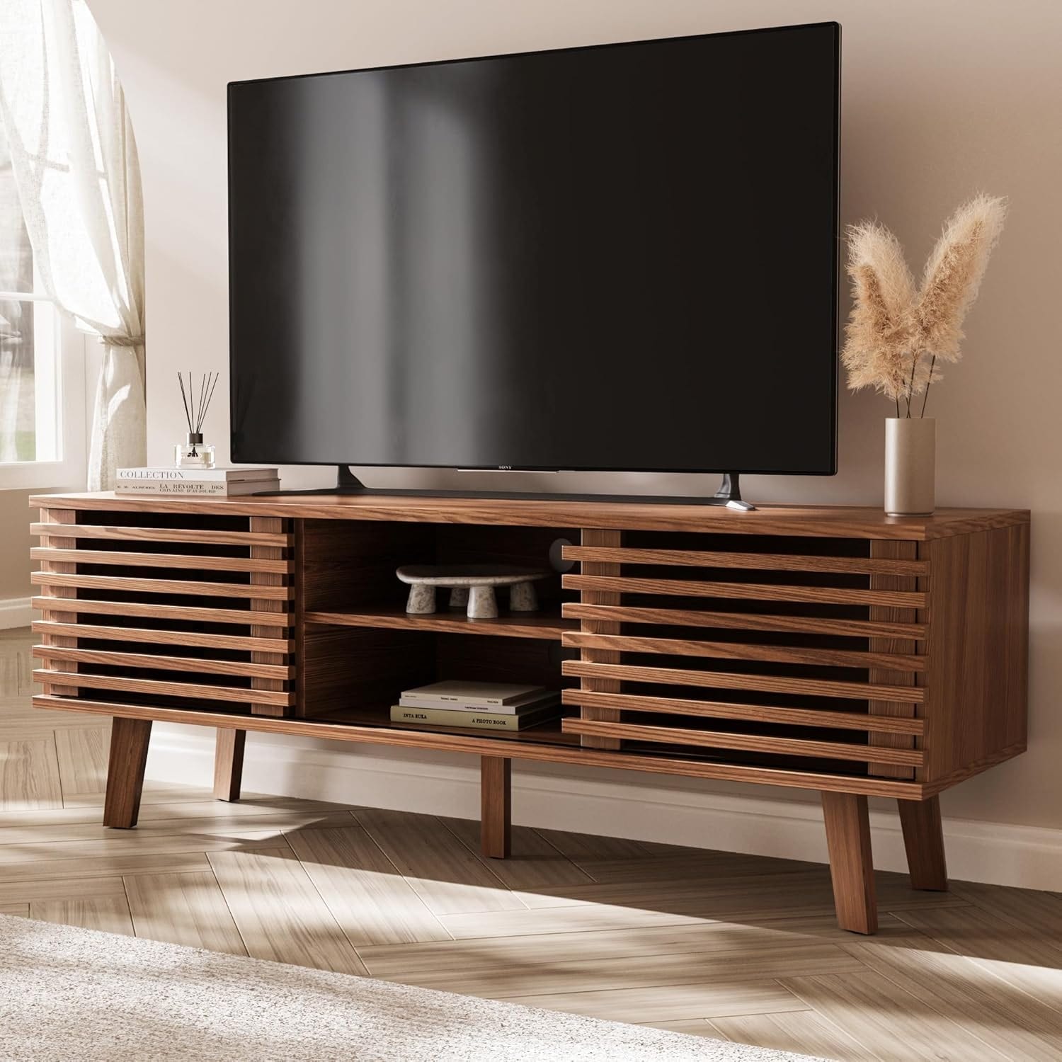 TV Stand for 50-60 inch, Retro Design with Storage Cabinet & Sliding Door, Living Room, Bedroom