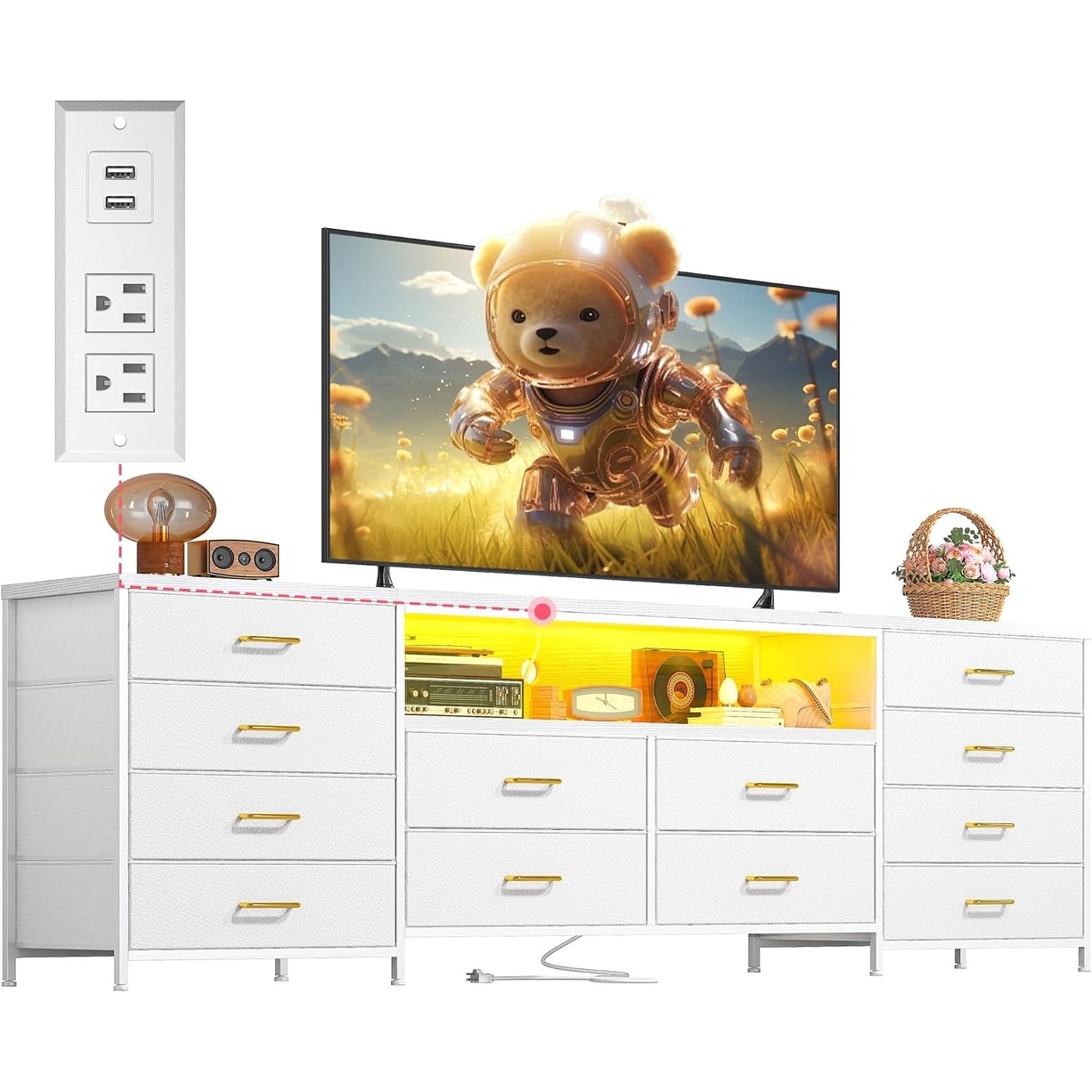 63" W White Dresser for Bedroom with LED Lights & Power Outlets, 12-Drawer Storage for Living Room or Hallway