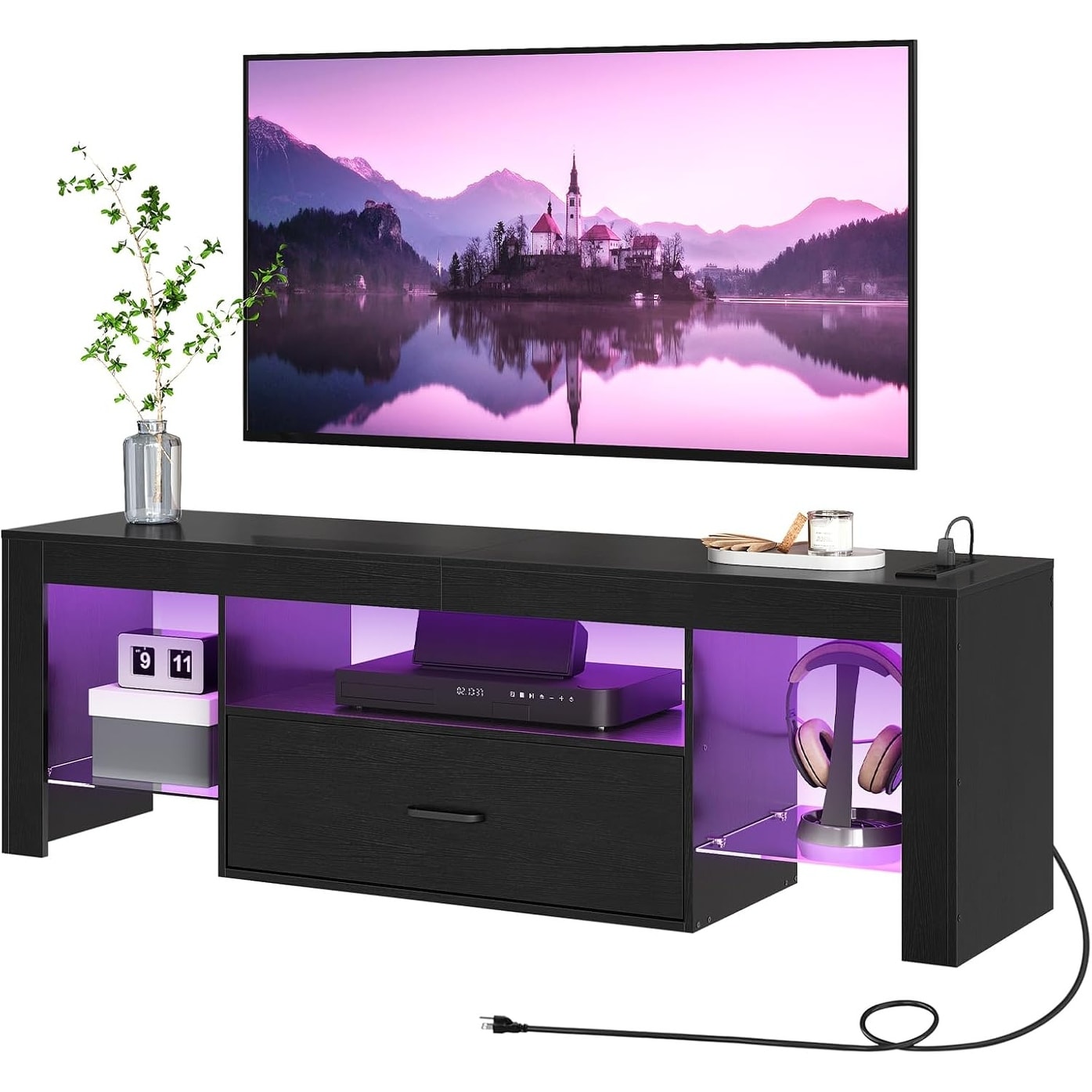 TV Stand with Power Outlets for 65" Screen, Glass Shelves & Drawer, Modern Media Console for Living Room, Black