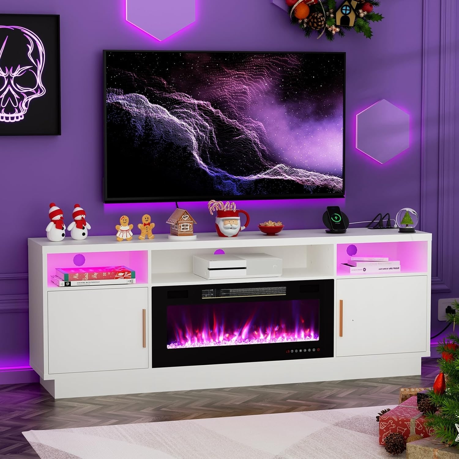 70 inch TV stand with LED fireplace - modern entertainment center with storage and power outlets - white