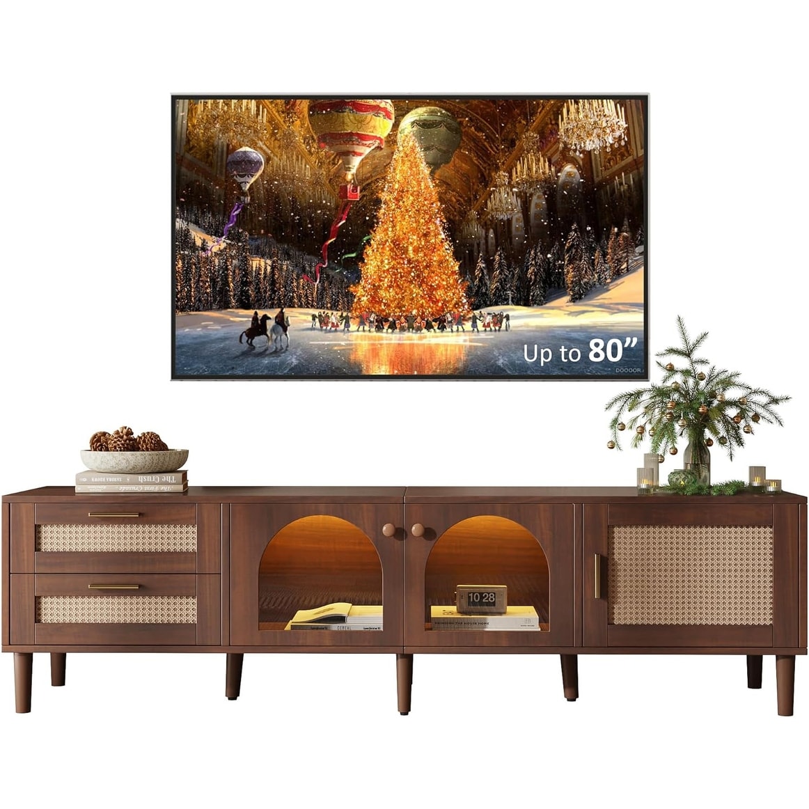 TV Stand for Living Room - Up to 80" Mid Century Modern Entertainment Center with Storage, Glass Doors, LED Light, Walnut 70"