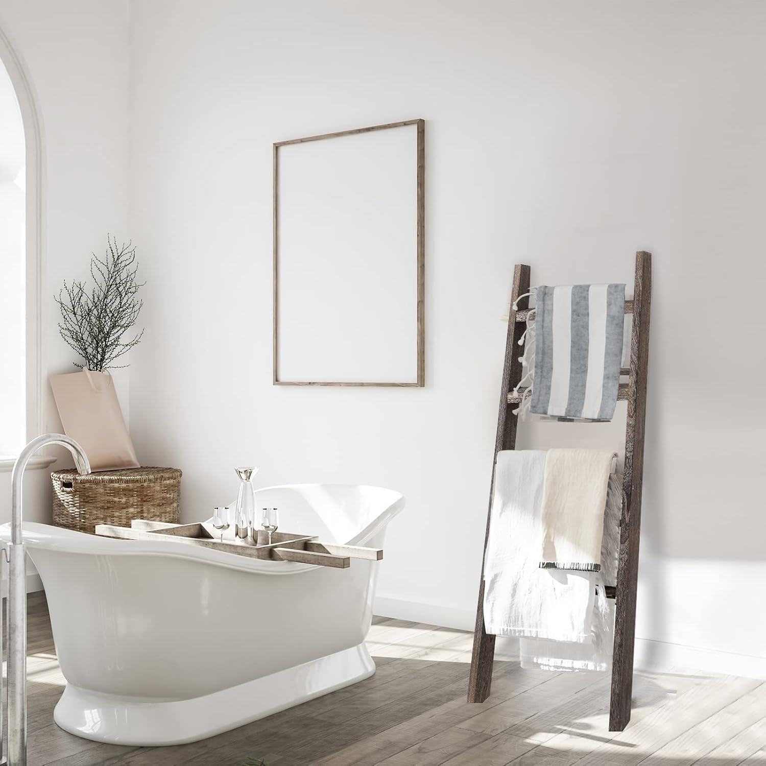 4-Tier Farmhouse Blanket Ladder Shelf - Decorative Wood Shelves and Quilt Rack for Boho Living Room Decor