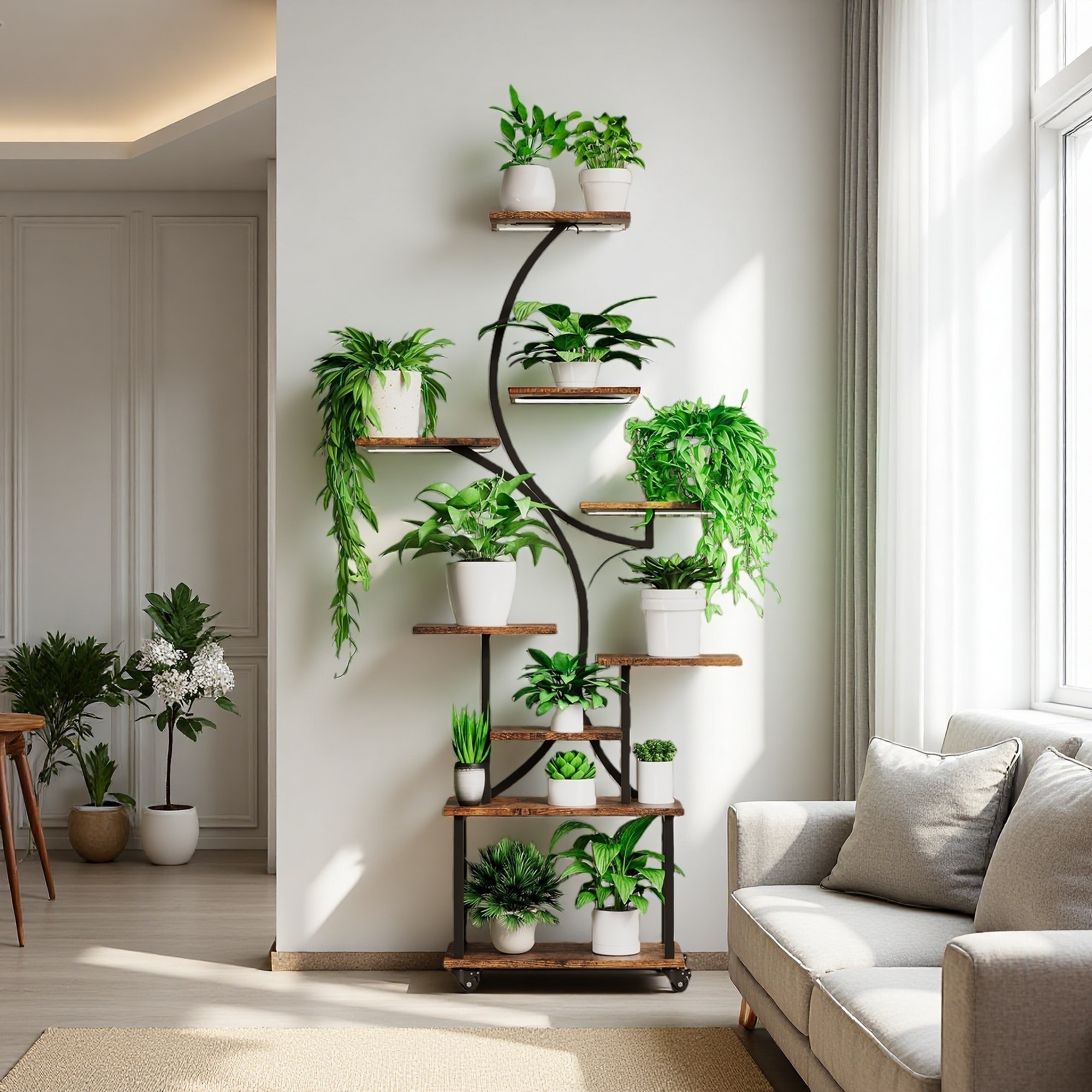 62.4"H Metal Indoor Plant Stand with Grow Lights, 8-Tier S-Shaped Plant Shelf with Wheels, Adjustable Full-Spectrum Lights