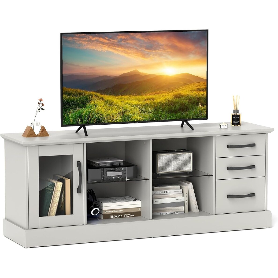 TV Stand for 75" TVs, 63" Media Console with Drawers & Glass Shelves, Cable Management, Gray