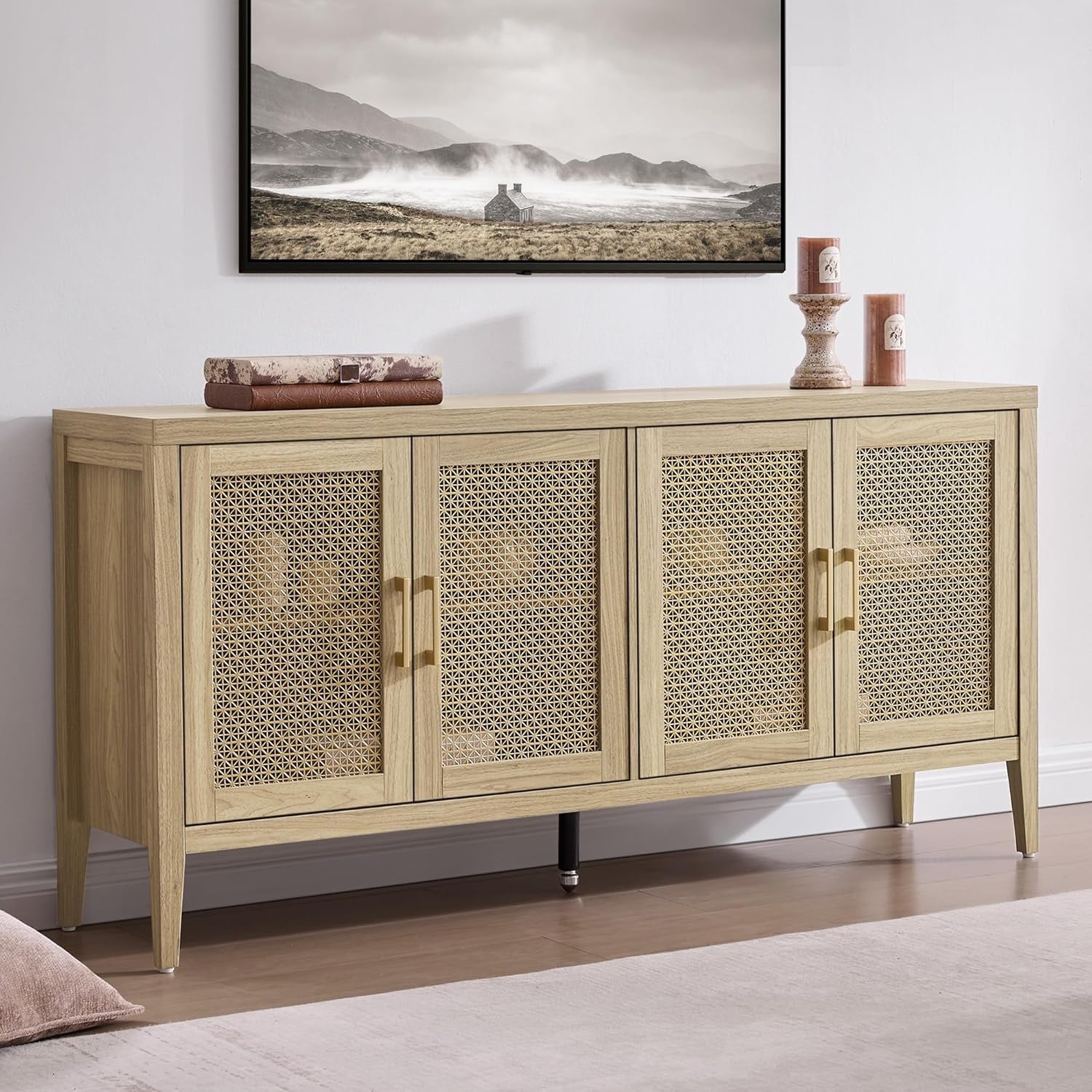 Farmhouse TV Stand with 4 Doors, 59" Media Console for Living Room Bedroom, Fits Up to 65" TV, Light Walnut