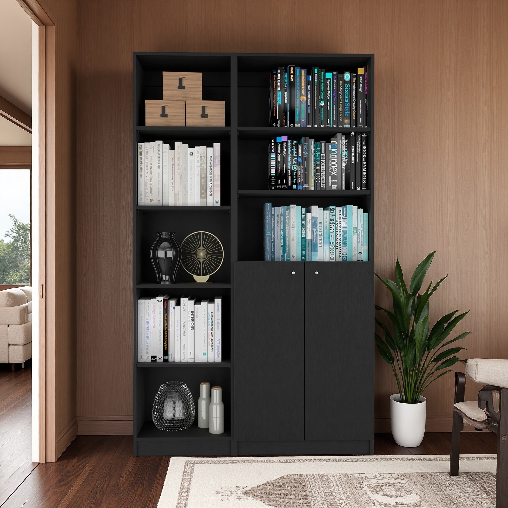 71.1"H 2-Piece Bookcase Set, Slim Design, 2-Door, Open Display & Concealed Storage