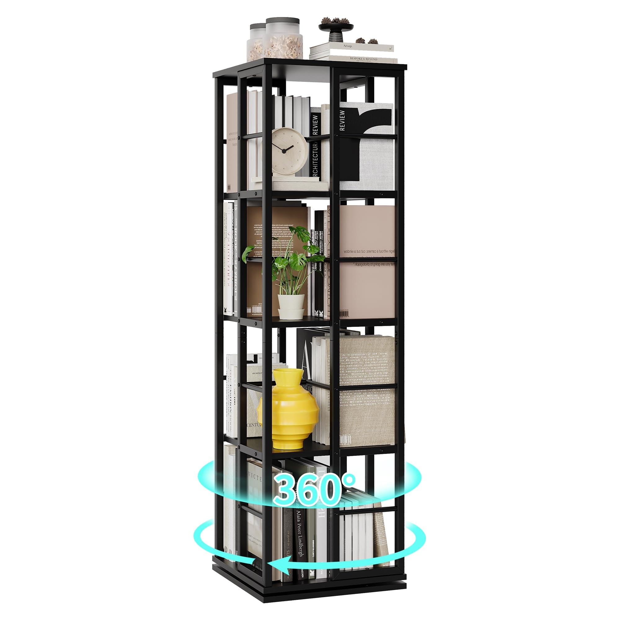 Garvee Revolving Bookshelf 15.7 x 15.7 x 54.1", 4 Tier 360°, Metal Frame with Safety Rails, Black