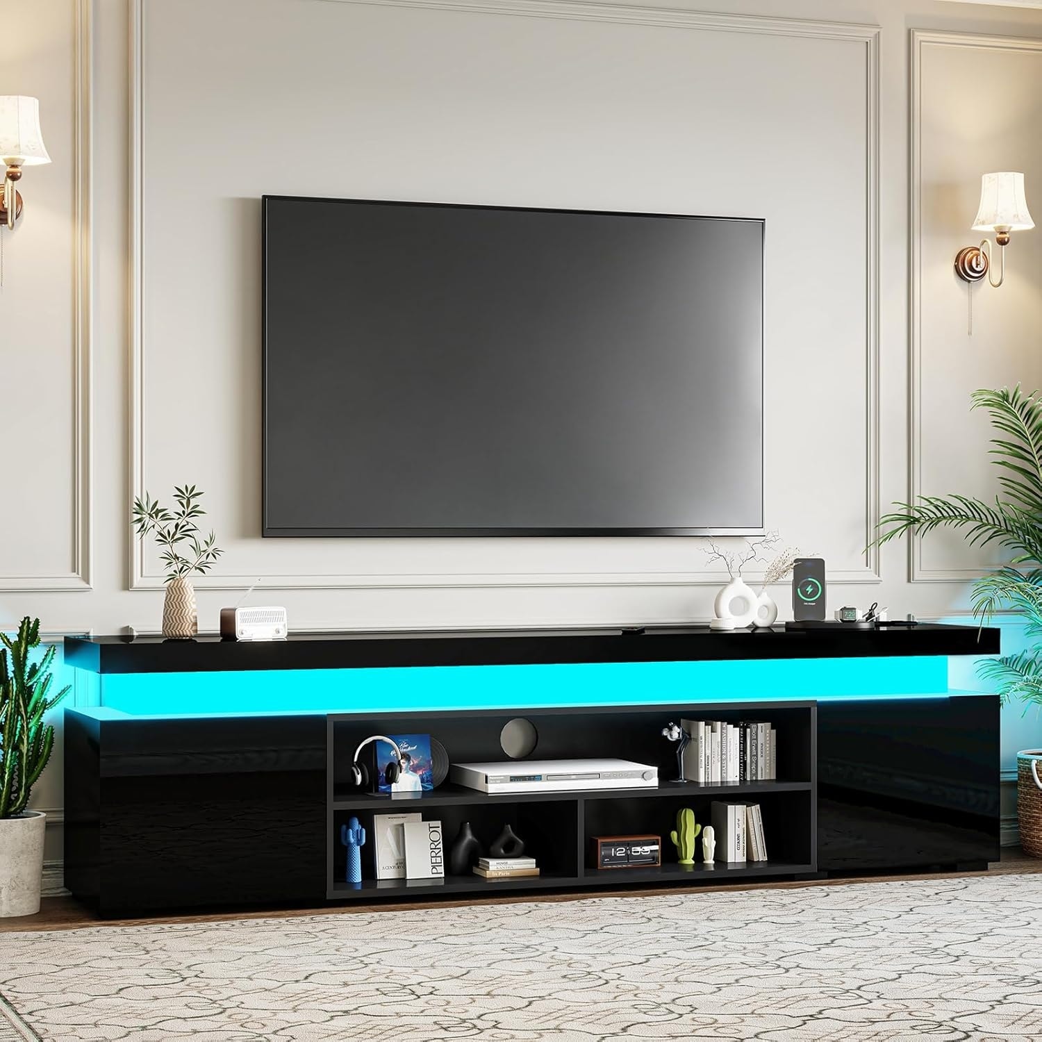 TV Stand for 100" TV, Modern Entertainment Center with LED Lights, High Gloss Cabinet w/Power Outlet & Open Shelves, Black