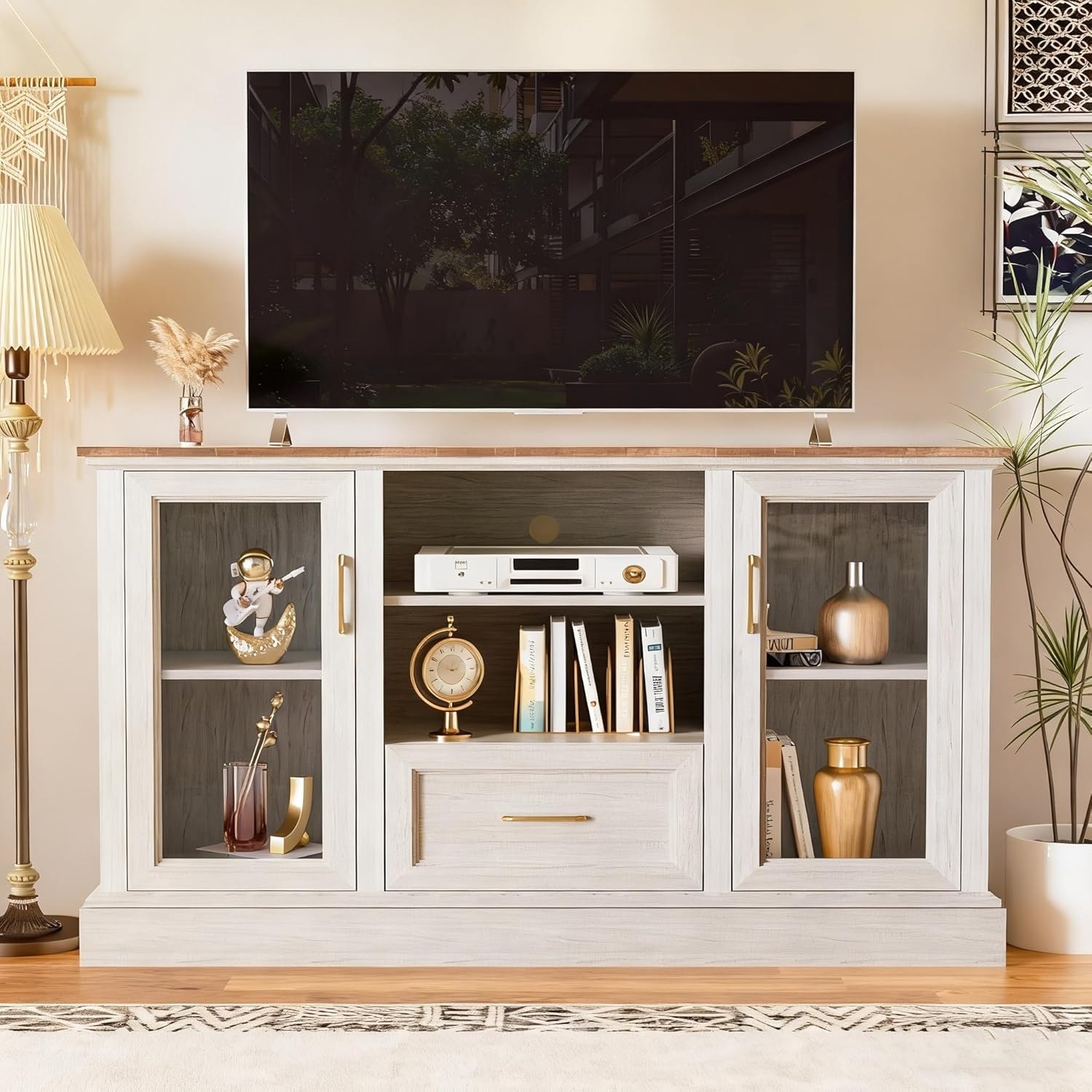 TV Stand for 55-65" with Glass Doors & Adjustable Shelves, Rustic White Media Console with Cubbies and Drawers