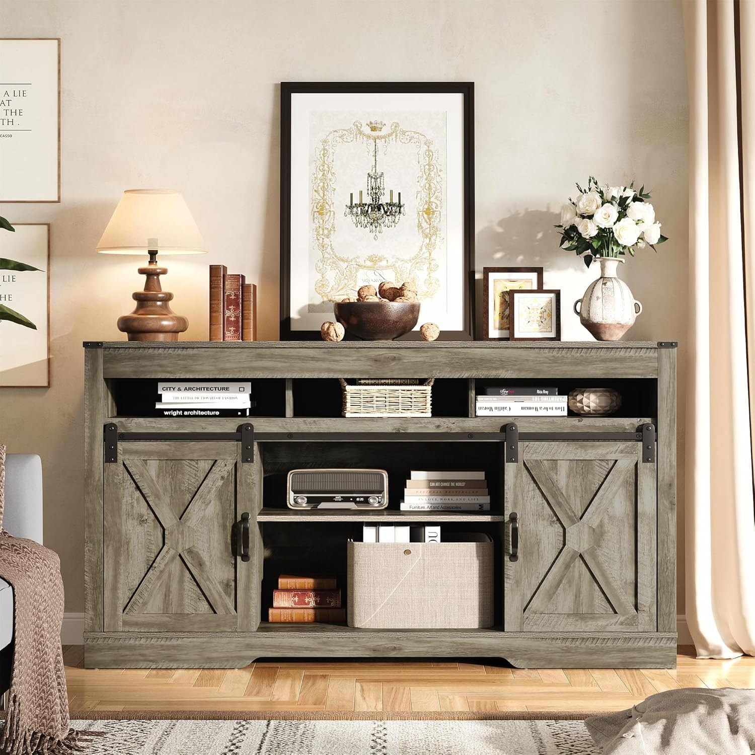 65 Inch TV Stand with Sliding Barn Doors, Espresso Entertainment Center with Storage Cabinet for 65+ Inch TVs