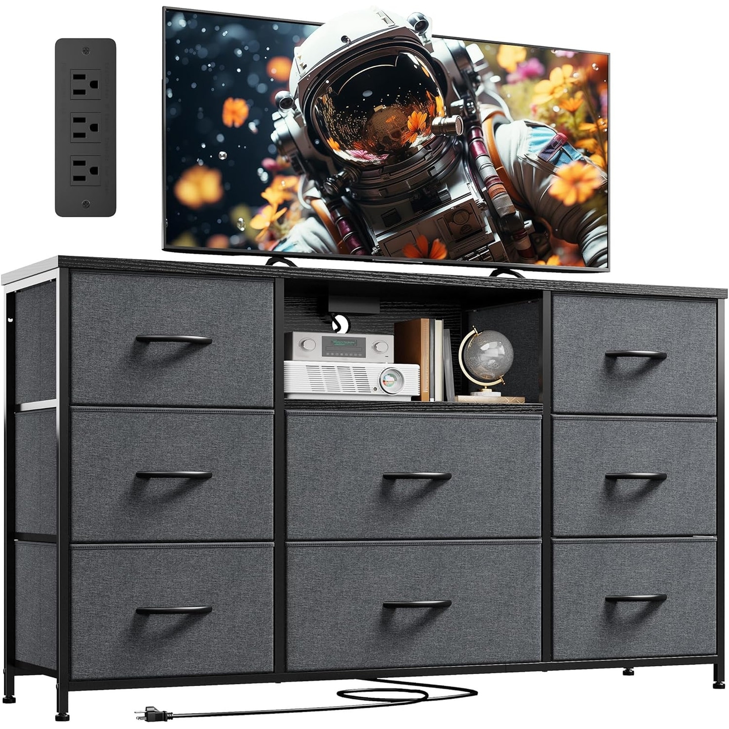 55" Dresser with Charging Station, 8-Drawer Fabric Chest with Open Shelves, Grey
