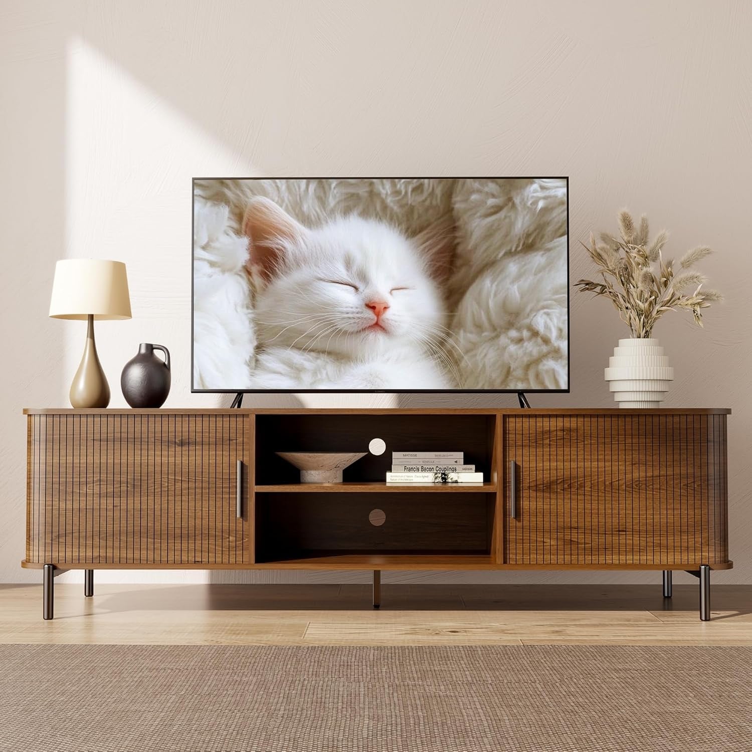 70" Fluted TV Stand with Storage, Sliding Doors & Open Shelves, Modern Entertainment Center for Living Room or Bedroom (Walnut)