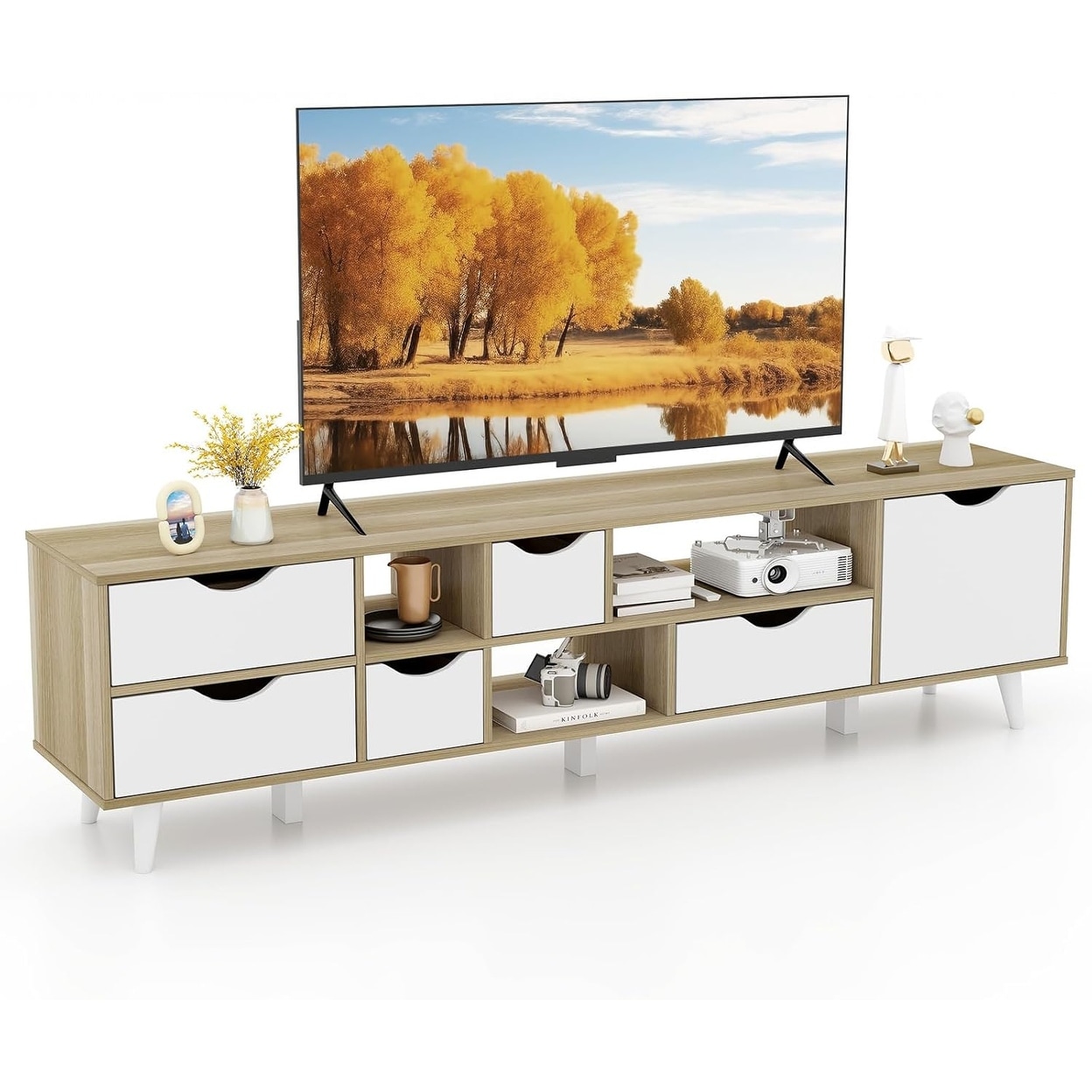 Modern TV Stand for 75" TVs, 2-in-1 Wood Media Console with 6 Compartments and Storage, 70.8" Oak Brown