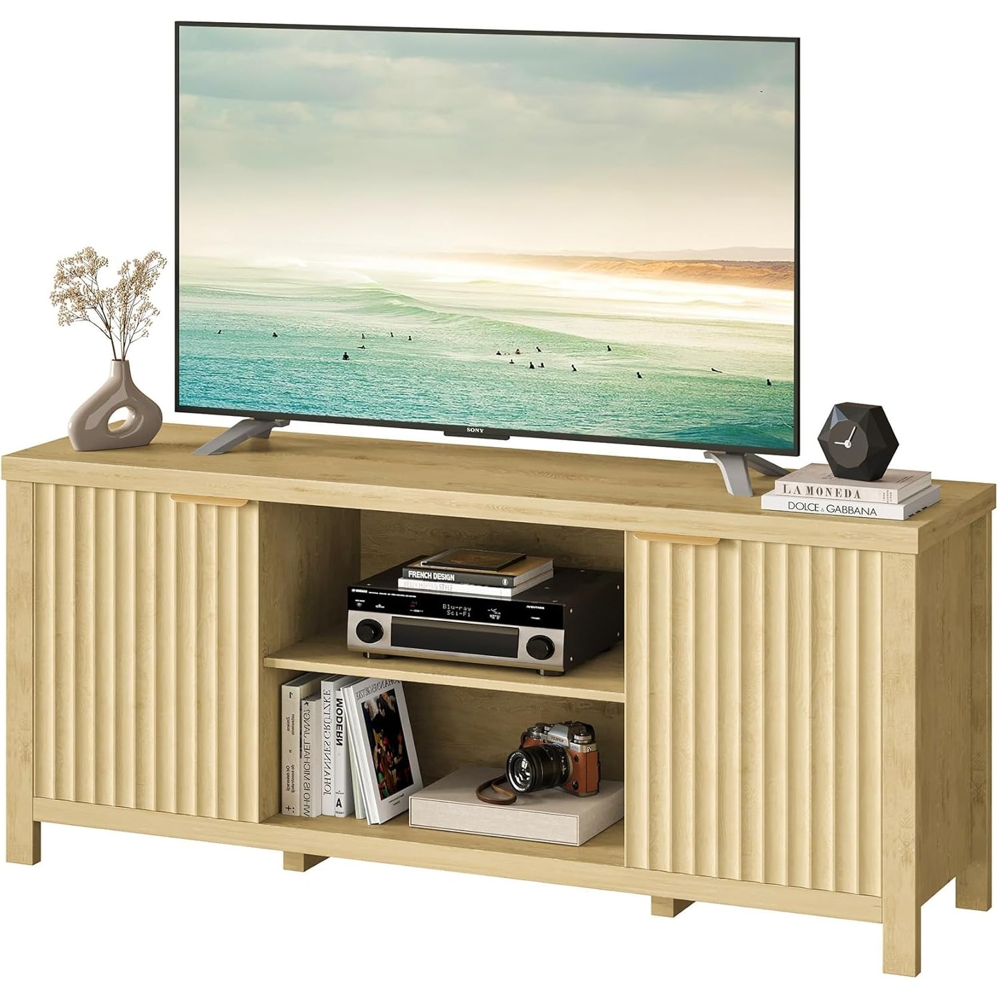 Mid Century TV Stand for 65" TVs, Adjustable Shelves, Fluted Wood Console for Living Room or Bedroom
