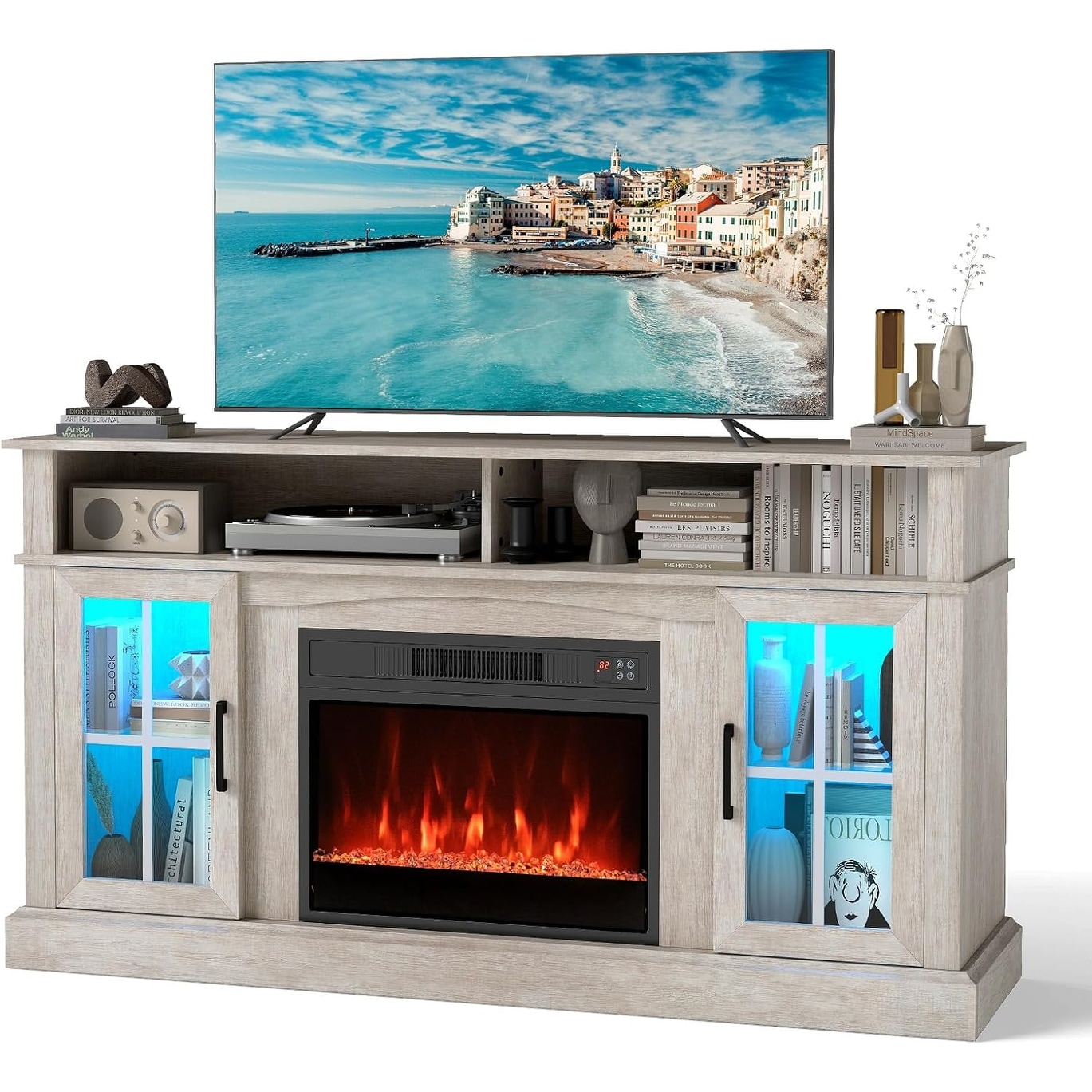 Electric Fireplace TV Stand for TVs Up to 65" with LED Lights, Remote, Adjustable Shelves, 1400W Heater, 6H Timer, 3-Level Flame