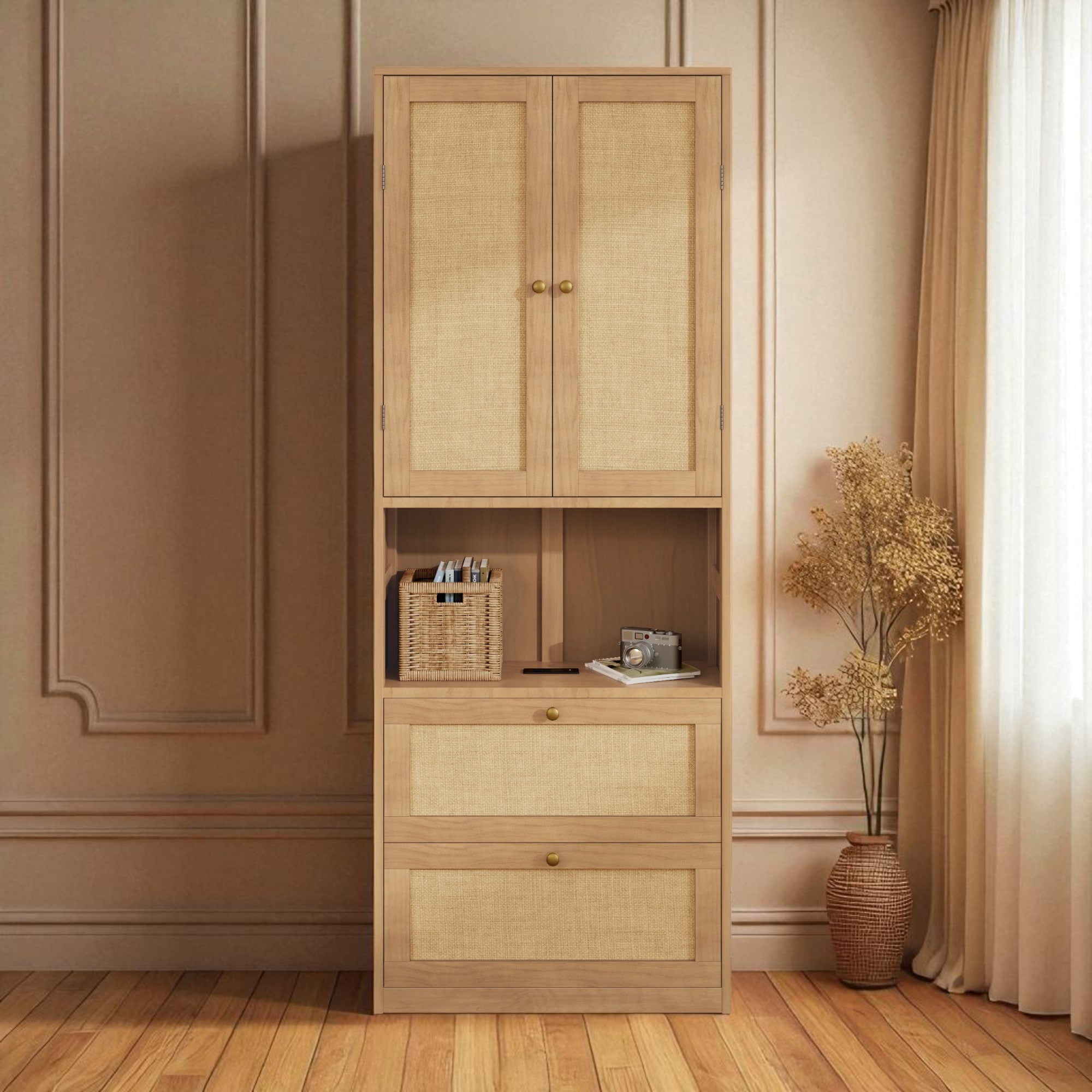 Tall Rattan Bookshelf Cabinet with 2 Doors, 3 Drawers and Open Shelves, Pine Wood Storage Cabinet with USB Port for Bedroom.