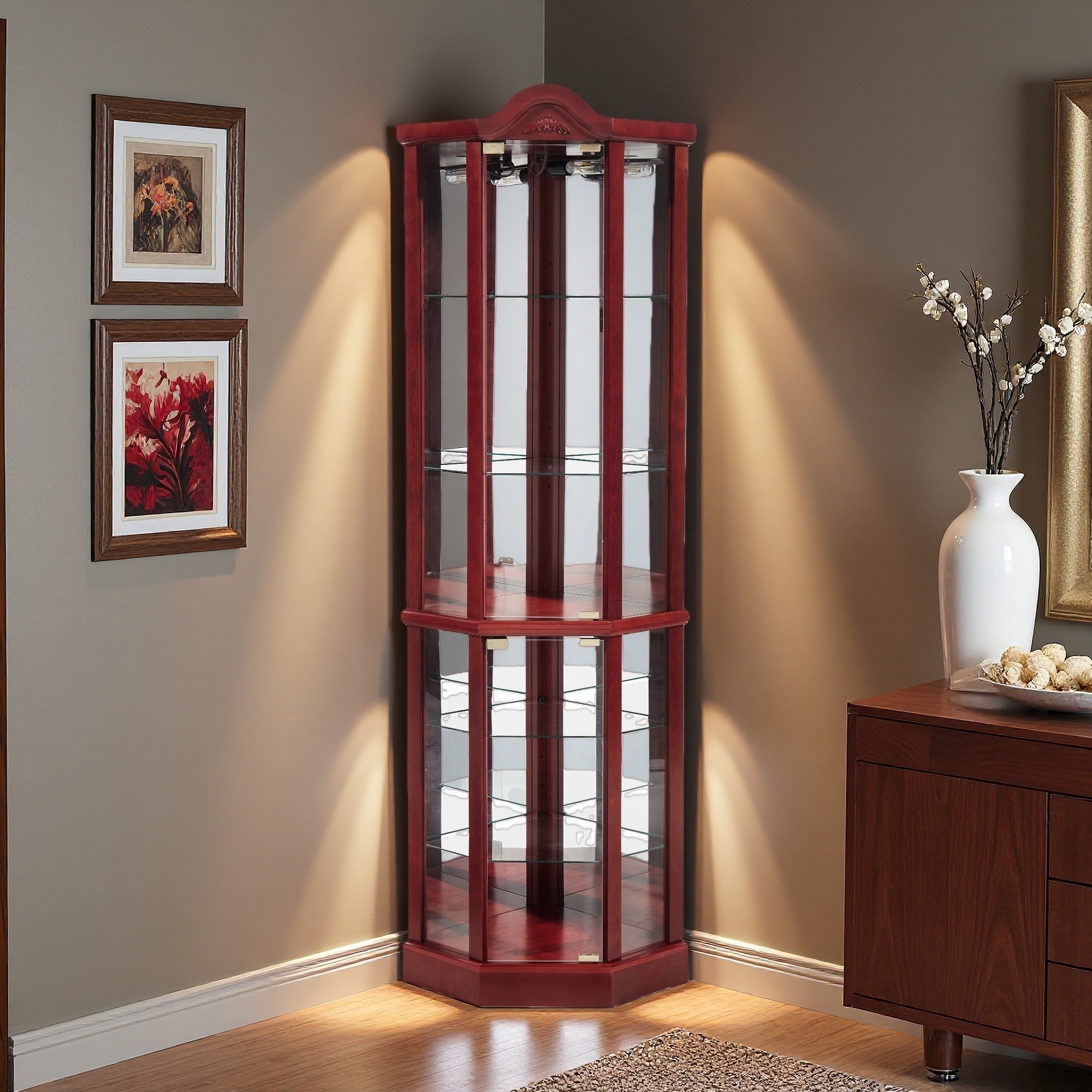 71.93" Lighted Glass Display Cabinet with Carved Decoration, Adjustable Shelves & Built-in Lighting Corner Curio Wine Cabinet